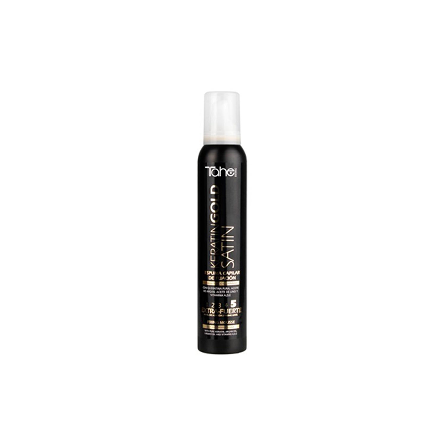Tahe Botanic Keratin Gold Satin Espuma de Fixação 5 200ml es un producto diseñado para proporcionar cuerpo, volumen y brillo a la fibra capilar. Su fórmula está especialmente pensada para mejorar la textura del cabello, facilitando un acabado radiante y con movimiento.