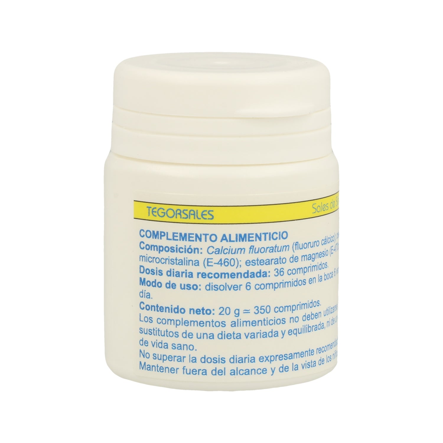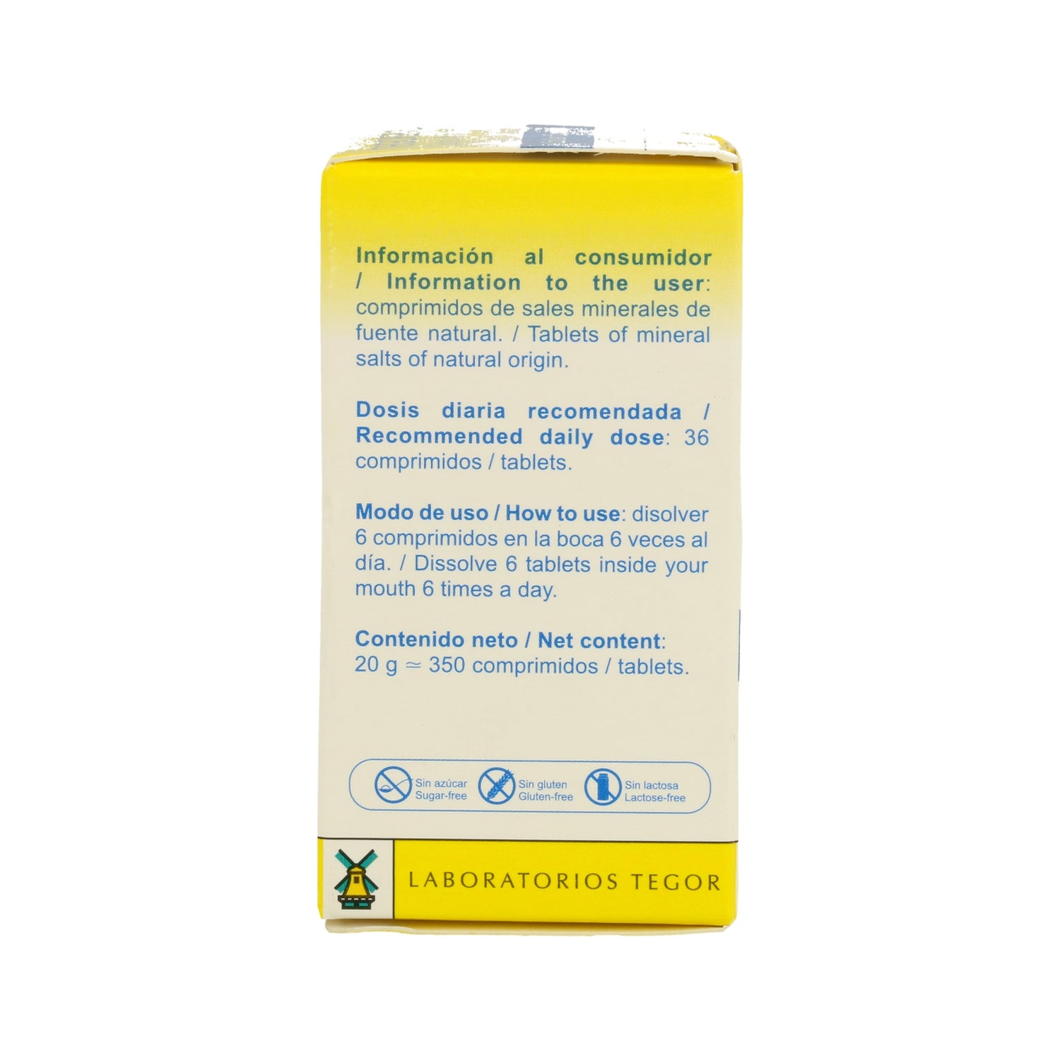 Complemento alimenticio que ayuda en la formación de huesos, tendones, ligamentos, dientes y uñas, reforzandose y haciéndolos más sólidos. Formulado a base de fluoruro de calcio. Aporta sales que nuestro cuerpo necesita. Se pueden tomar 12 sales, y también tomarlas de forma preventiva y solo se aprovecharán las que el cuerpo carezca. Formato de 350 comprimidos.
