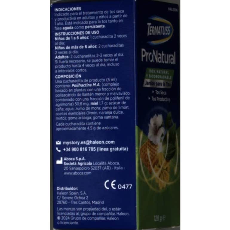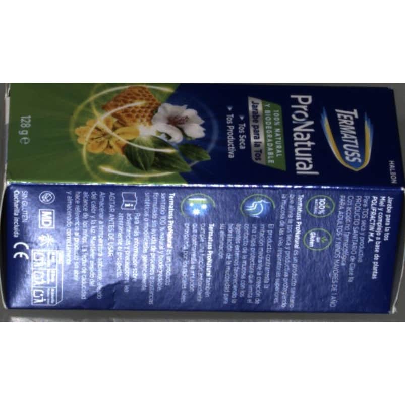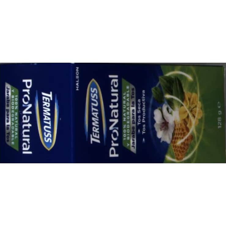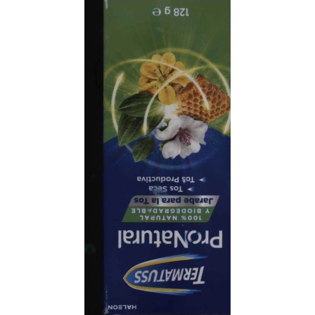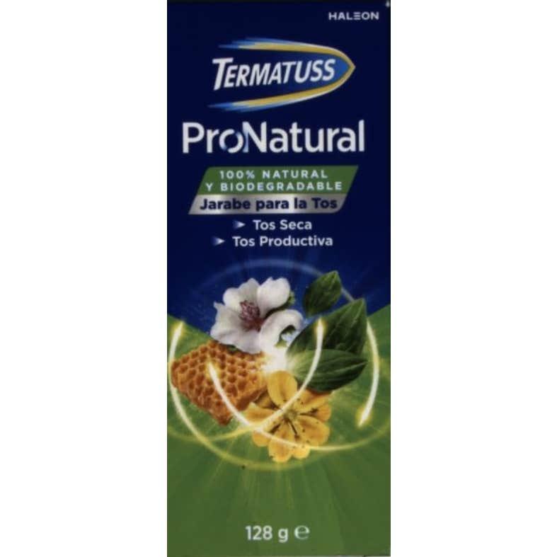 Jarabe para la tos seca y la tos con mocos o productiva de la marca termatuss ProNatural de origen 100% natural con una eficacia rápida que ayuda a calmar la garganta y a descongestionar las vías respiratorias, protegiendo la garganta de irritaciones al crear una capa protectora y a expulsar la mucosidad. Contiene azúcar de caña, zumo de mora y limón, miel, aceites esenciales, goma xantana y goma arábica.