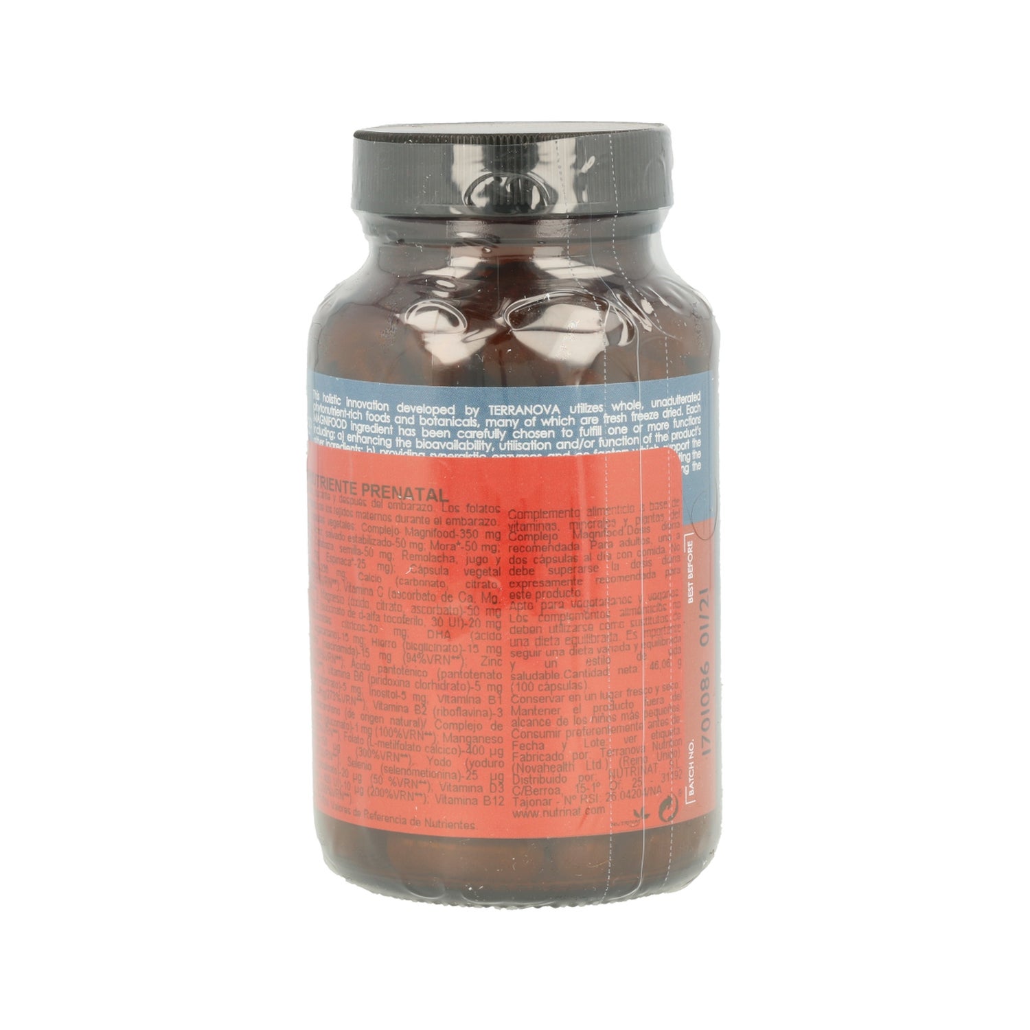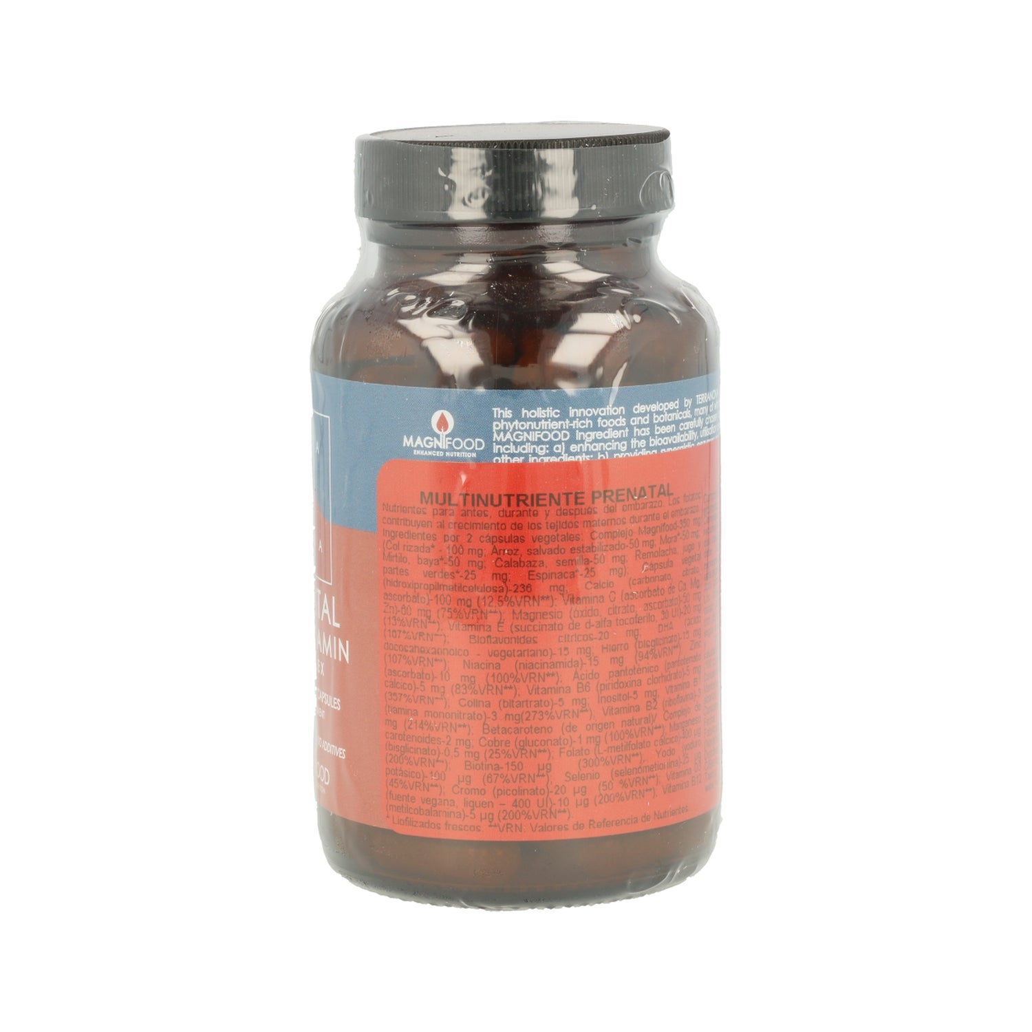 Col rizada (100 mg), Arroz (50 mg), Mora (50 mg), Mirtilo (50 mg), Calabaza (50 mg), Remolacha (25 mg), Espinaca (25 mg), Cápsula vegetal (236 mg), Calcio (100 mg), Vitamina C (60 mg), Magnesio (50 mg), Vitamina E (20 mg), Bioflavonides (20 mg), DHA (15 mg), Hierro (15 mg), Niacina (15 mg), Zinc (10 mg), Ácido pantoténico (5 mg), Vitamina B6 (5 mg), Colina (5 mg), Inositol (5 mg), Vitamina B1 (3 mg), Vitamina B2 (3 mg), Betacaroteno (2 mg), Cobre (1 mg), Manganeso (0,5 mg), Folato (400 microgramo), Biotina (150 microgramo), Yodo (100 microgramo), Selenio (25 microgramo), Cromo (20 microgramo), Vitamina D3 (10 microgramo), Vitamina B12 (5 microgramo).
