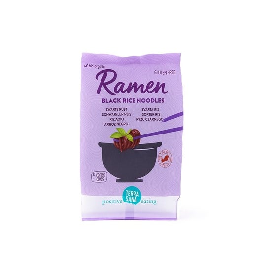 Fideos ramen de arroz negro sin gluten. Elaborados a partir de arroz integral negro orgánico. Se mantienen firmes en la sopa de miso o en el wok.
