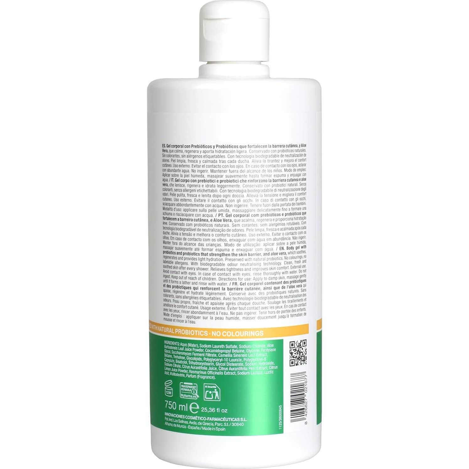 Th Pharma Gel Corporal Probiotic Aloe Vera 750 ml es un gel de baño con probióticos naturales y aloe vera orgánico. Está indicado para pieles secas, sensibles e irritadas. Favorece el cuidado diario y ayuda a mantener la microbiota natural de la piel, a la vez que aporta hidratación.