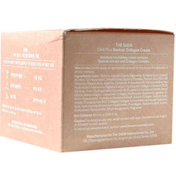 The Saem Care Plus Baobab Collagen Cream es una crema hidratante nutritiva que combina extracto de Baobab y un complejo de colágeno. Esta fórmula está diseñada para aportar regeneración y firmeza a la piel, ayudando a mejorar su apariencia general.