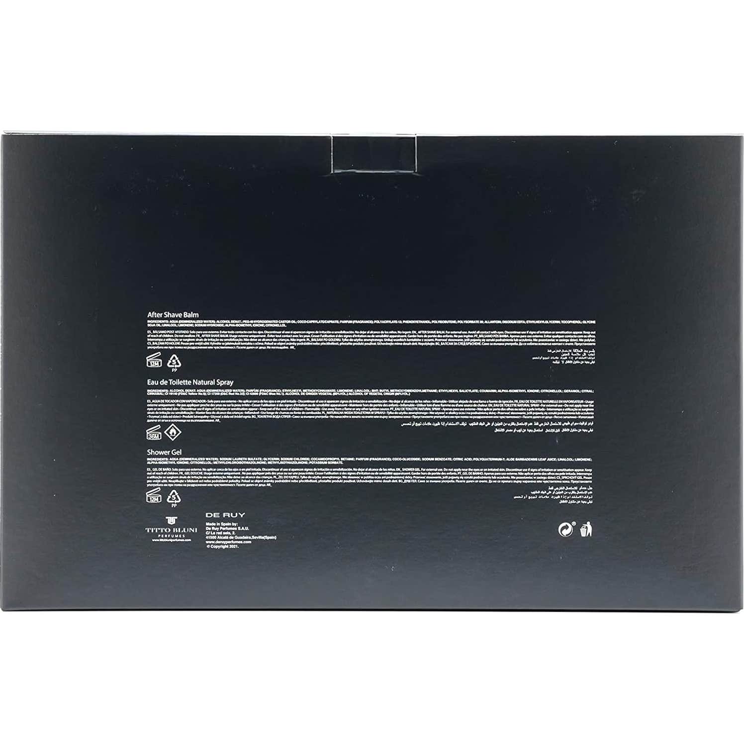 Titto Bluni Assoluto Nero Uomo Set incluye un Eau de Toilette de 75 ml, un gel de baño de 75 ml y un after shave de 75 ml. Este conjunto ofrece una experiencia completa de cuidado personal.