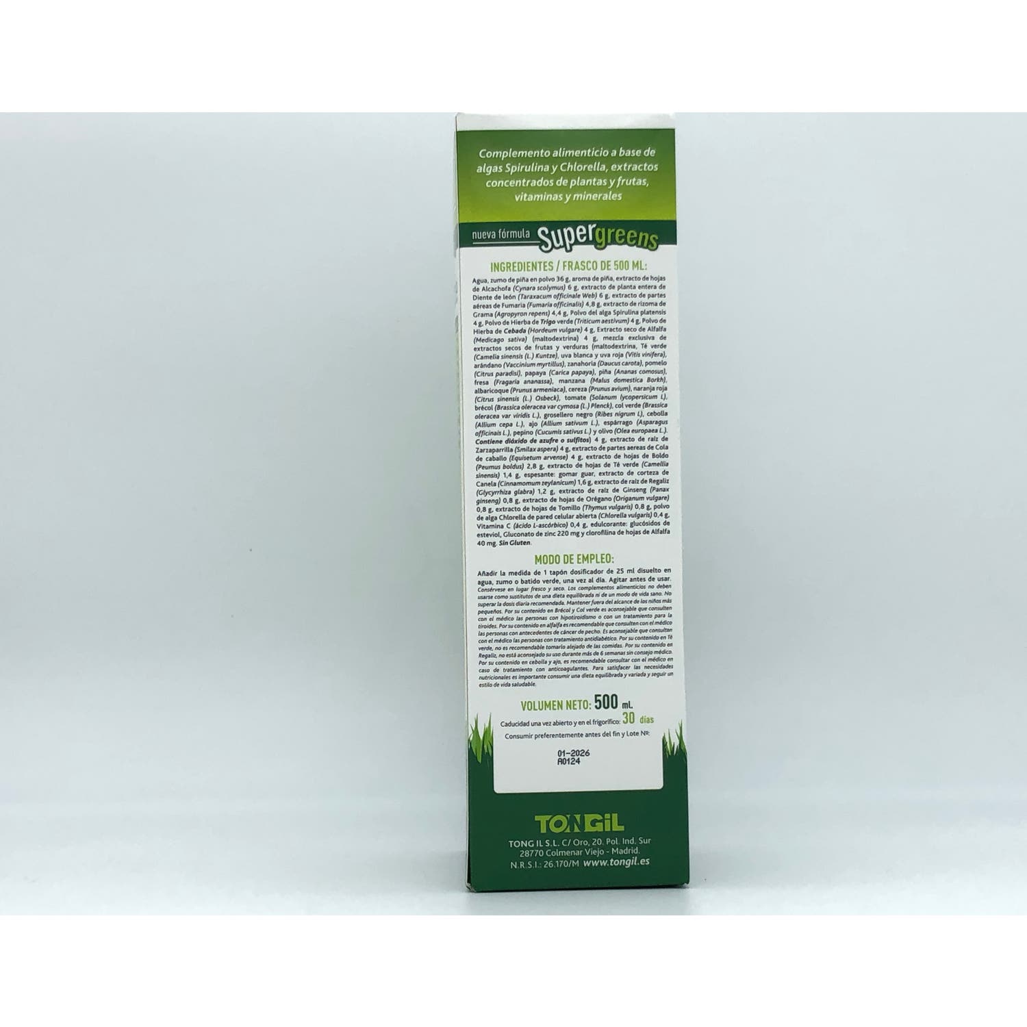 Por 25 ml: Polvo del alga Spirulina platensis (200 mg), Polvo de Hierba de Trigo (200 mg), Polvo de Hierba de Cebada (200 mg), Extracto seco de Alfalfa (200 mg), Polvo del alga Chlorella de pared celular abierta (20 mg), Clorofila (procedente de hoja de Alfalfa) (2 mg), Extracto fluido de hojas de Alcachofa (300 mg), Extracto fluido de planta entera de Diente de León (300 mg), Extracto fluido de partes aéreas de Fumaria (240 mg), Extracto de rizoma de Grama (220 mg), Mezcla exclusiva de extractos secos de frutas y verduras: Té verde, Uva blanca y Roja, Arándano, Zanahoria, Pomelo, Papaya, Piña, Fresa, Manzana, Albaricoque, Cereza, Naranja roja, Brécol, Col verde, Cebolla, Ajo, Tomate, Grosellero negro, Espárrago, Pepino, Olivo (200 mg), Extracto fluido de raíz de Zarzaparrilla (200 mg), Extracto fluido de tallo de Cola de Caballo (200 mg), Extracto fluido de hojas de Boldo (140 mg), Extracto fluido de hojas de Té verde (140 mg), Extracto fluido de corteza de Canela (80 mg), Extracto fluido de raíz de Regaliz (60 mg), Extracto fluido de raíz de Ginseng (40 mg), Extracto fluido de hojas de Orégano (40 mg), Extracto fluido de Tomillo (40 mg), Vitamina C (ácido L-ascórbico) (20 mg), Gluconato de zinc (11 mg): que aportan (1,54 mg) de zinc, Zumo de piña en polvo (1,8 g).