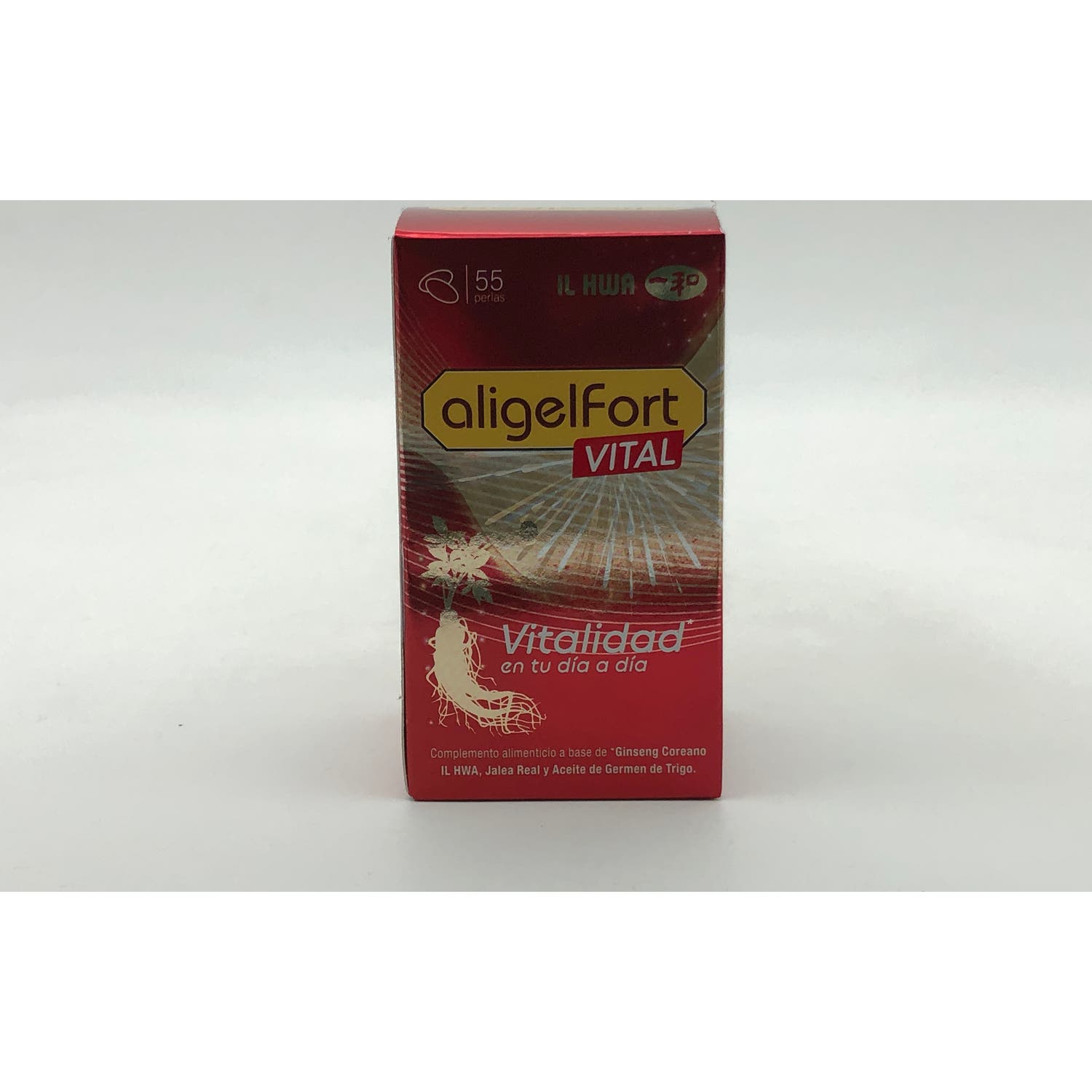 Tongil Aligel Fort Il Hwa 55comps es un complemento alimenticio a base de extracto seco de raíz entera de Ginseng Coreano IL HWA 5:1 (Panax ginseng C.A Meyer) de 6 años de edad, Jalea Real y aceite de germen de trigo.