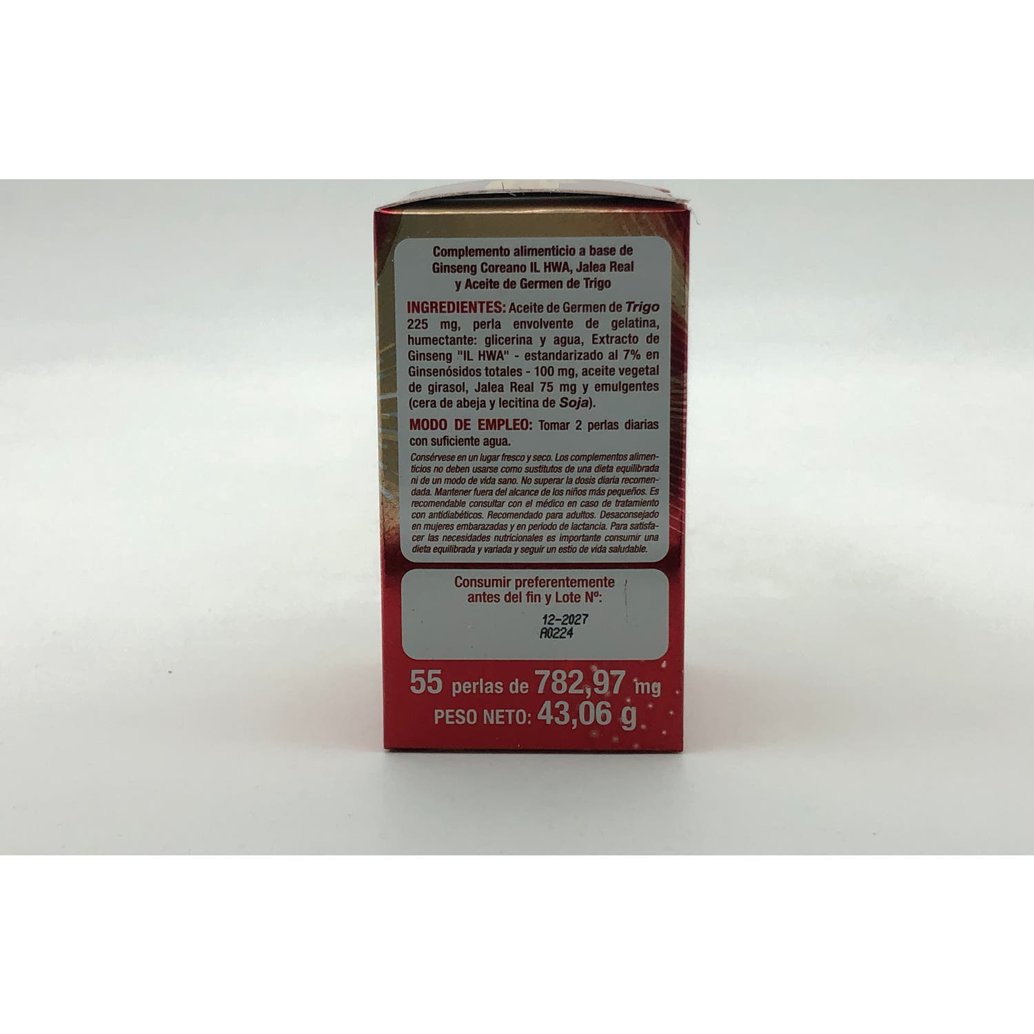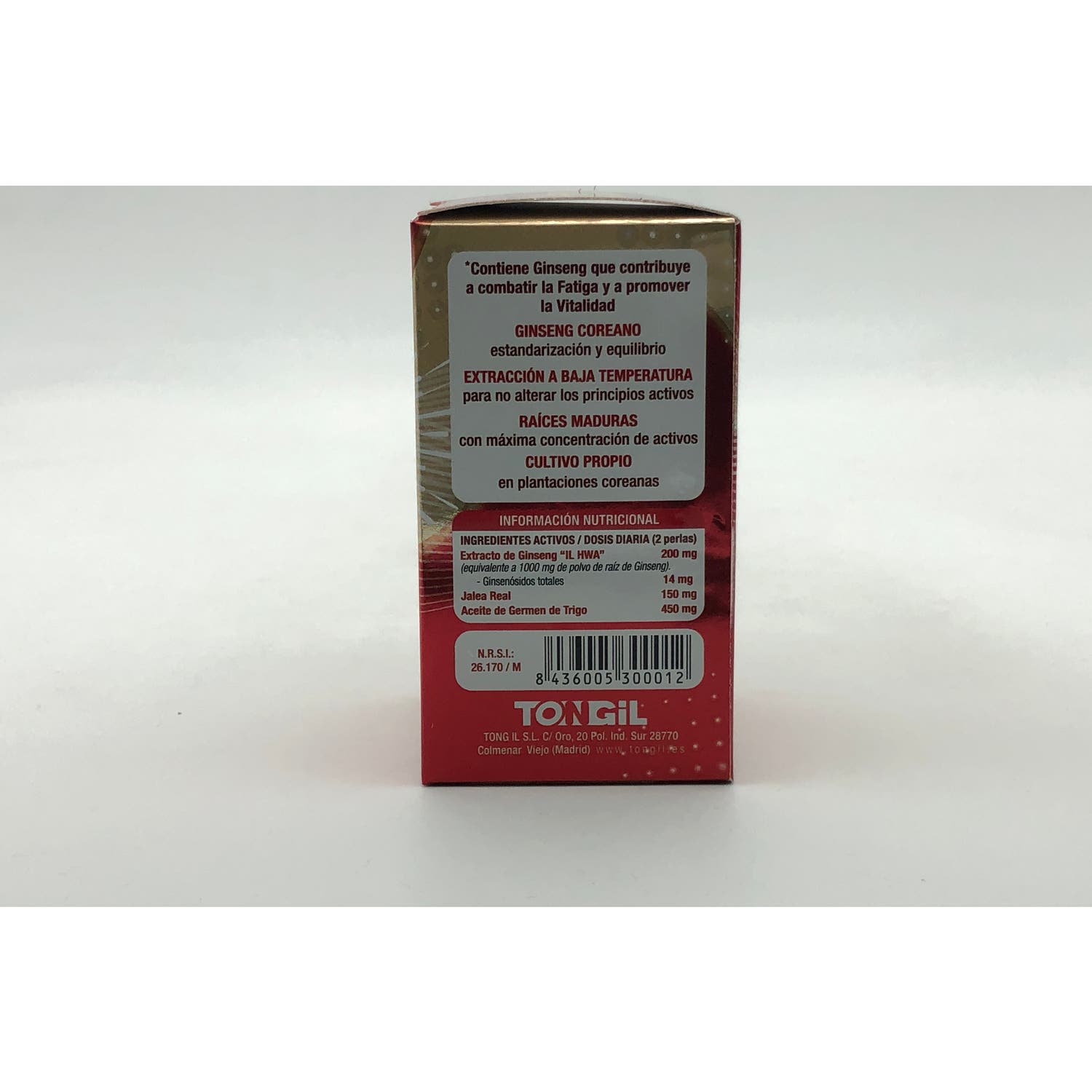 Extracto 5:1 de raíz entera de Ginseng coreano IL HWA (Panax ginseng C.A Meyer) de 6 años de edad 200 mg (equivalente a 1000 mg de polvo de raíz), Jalea real 150 mg, Aceite de germen de trigo 450 mg y Perla envolvente de gelatina, glicerina y agua, aceite vegetal de girasol, cera de abeja, lecitina de soja.