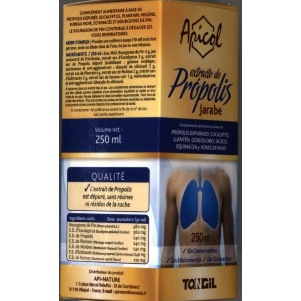 Tongil Apicol Jarabe Extracto de Própolis 250ml es un complemento natural expectorante y balsámico elaborado con própolis depurado y extracto de planta que contribuyen a liberar las vías respiratorias.