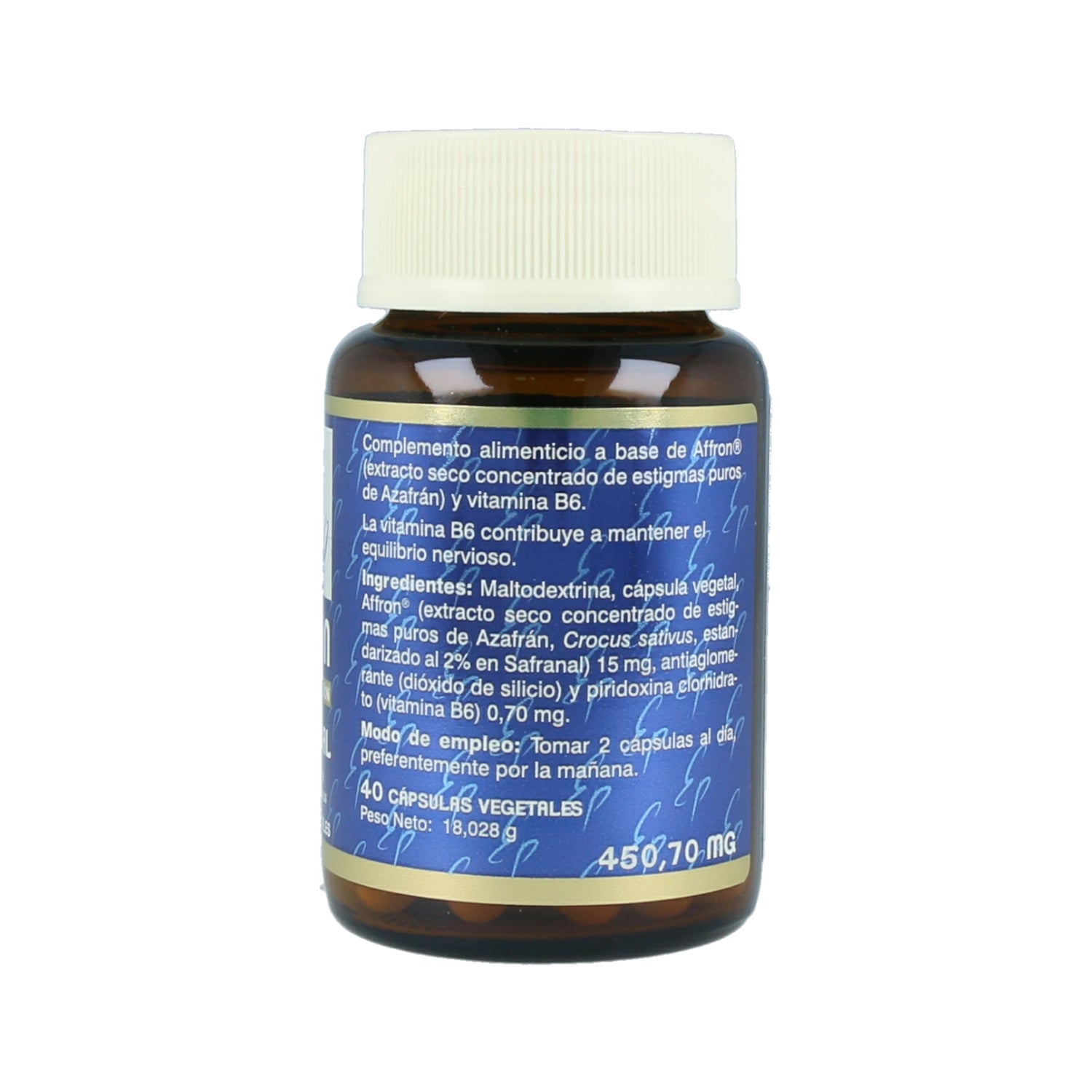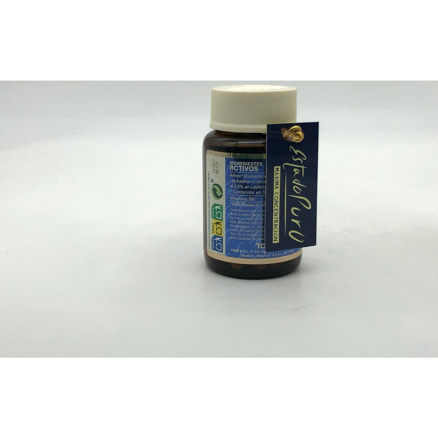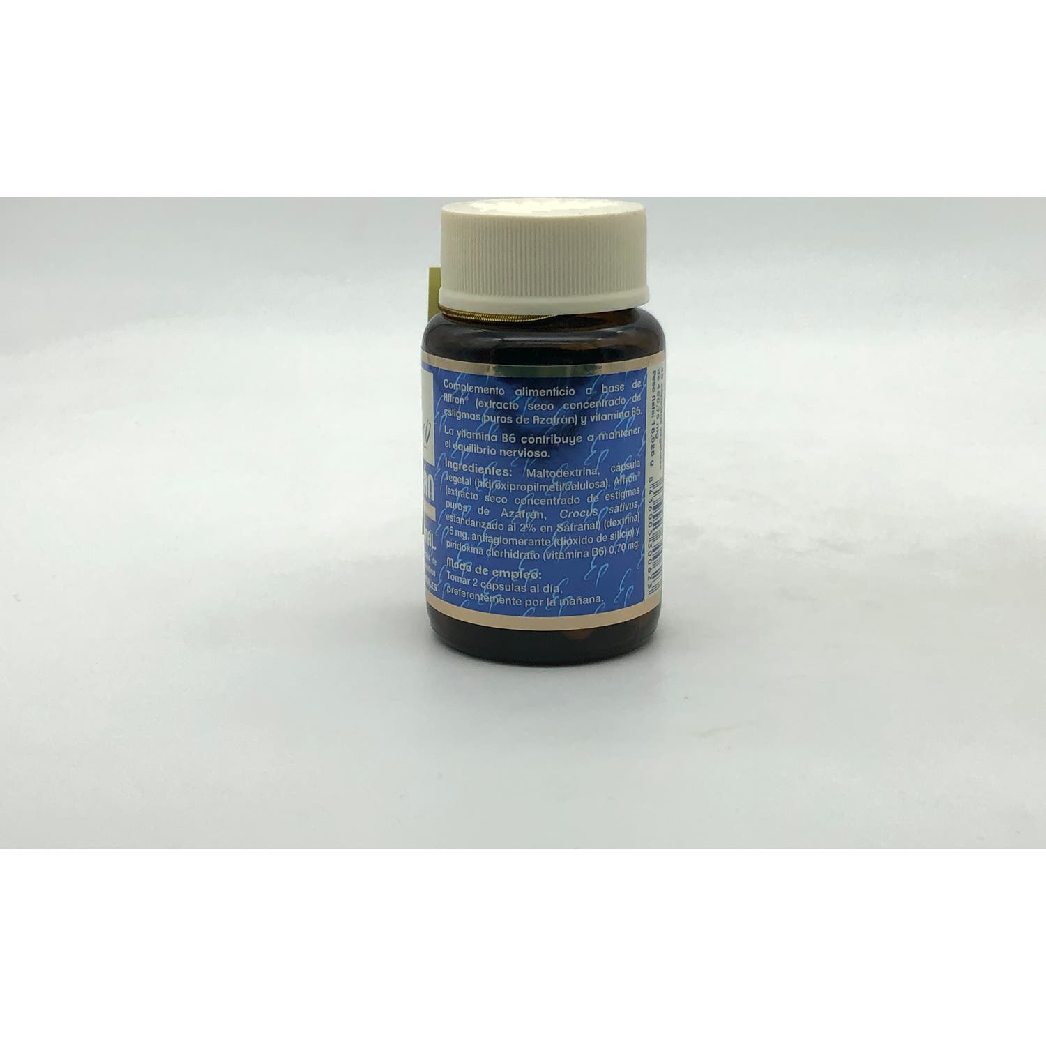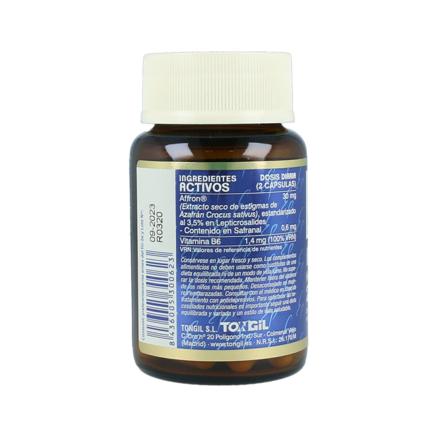 Por 2 cápsulas: Affron (Extracto seco de estigmas de Azafrán Crocus sativus) estandarizado al (3,5 %) en Lepticrosalides (30 mg),: Contenido en Safranal 0,6 mg, Vitamina B6 1,4 mg.