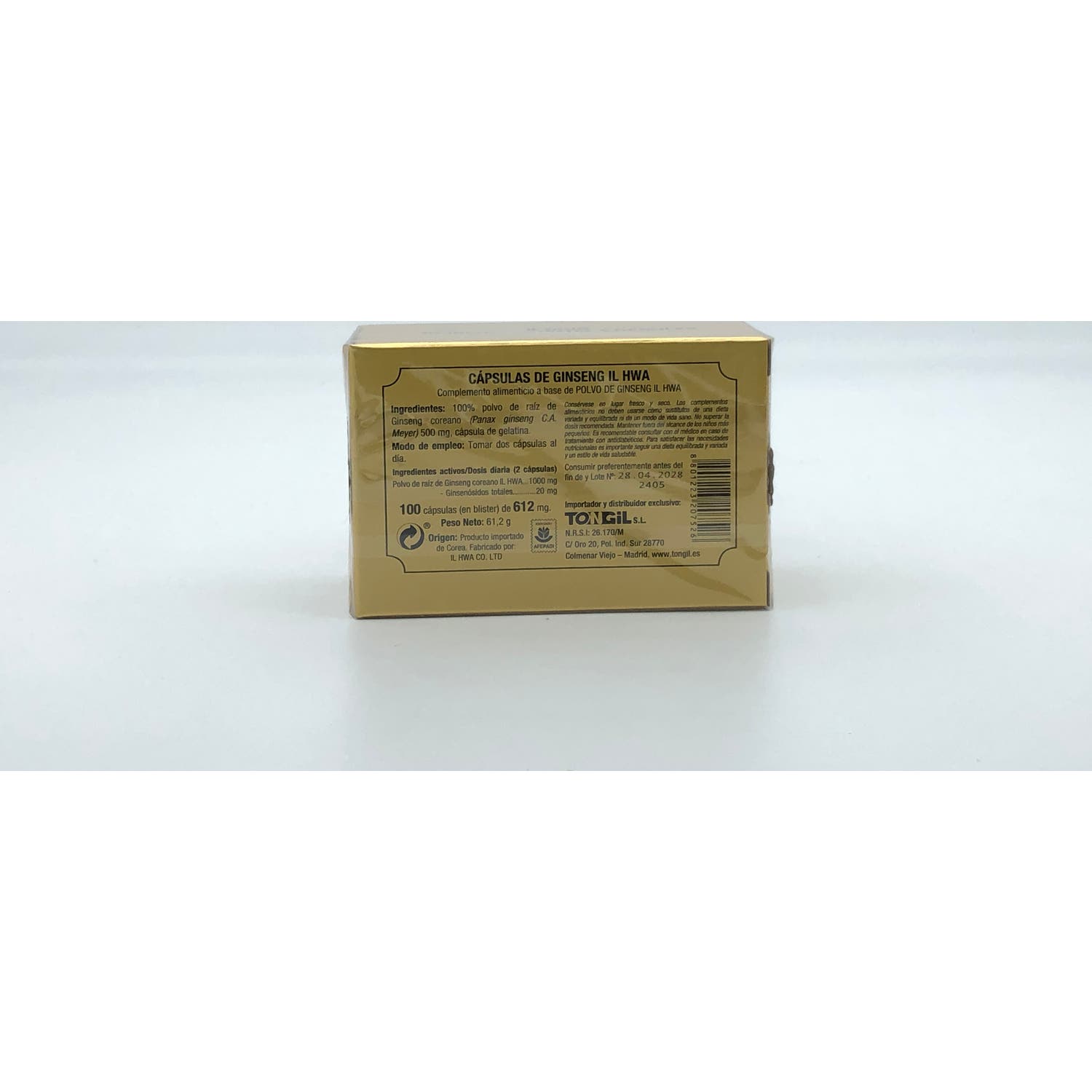 Tongil Ginseng Coreano Il Hwa 100caps es un complemento alimenticio a base de polvo de raíz entera de Ginseng coreano IL HWA (Panax ginseng C.A Meyer) de 6 años de edad.