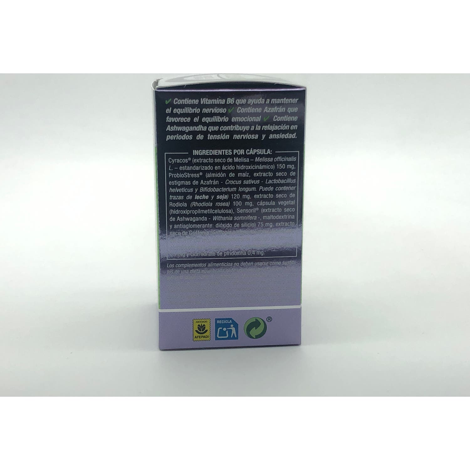 El azafrán favorece el equilibrio emocional y la Vitamina B6 ayuda a mantener el equilibrio nervioso. La ashwagandha contribuye a la relajación en periodos de tensión nerviosa. La rodiola ayuda al organismo a adaptarse al estrés emocional y tiene un efecto beneficioso en la fatiga y los dolores de cabeza inducidos por el estrés. La melisa contribuye a reducir la intranquilidad y las tensiones. La griffonia contribuye a la mejora de la actividad cerebral.