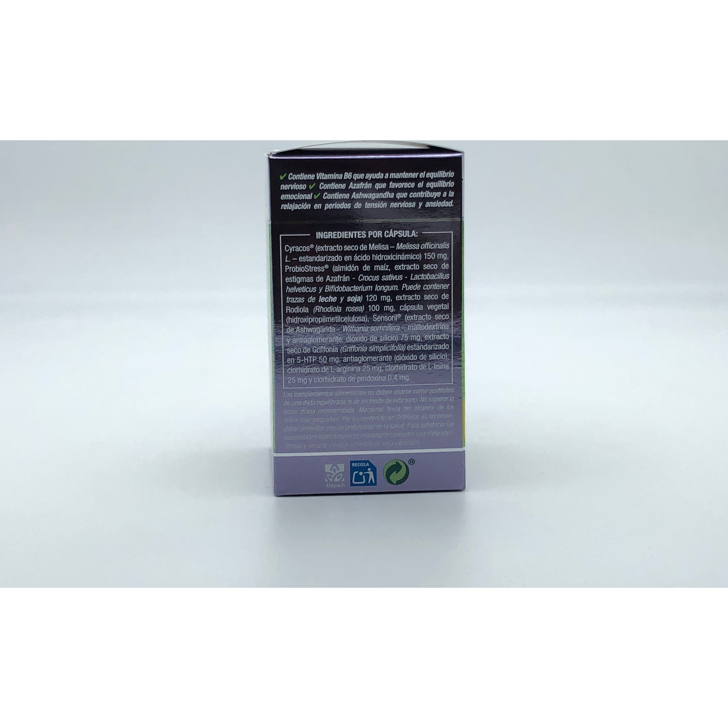 Elaborado a base de ingredientes adaptógenos mejoran los procesos de nerviosismo como vitamina B6, 5-HTP, Rodiola, extractos patentados de Melisa (Cyracos®), Ashwagandha (Sensoril®) que actúa como coadyuvante para conseguir relajación en procesos de nerviosismo y ansiedad. Además de una mezcla patentada de alta tecnología a base de extracto de Azafrán y fermentos lácticos (ProbioStress®).