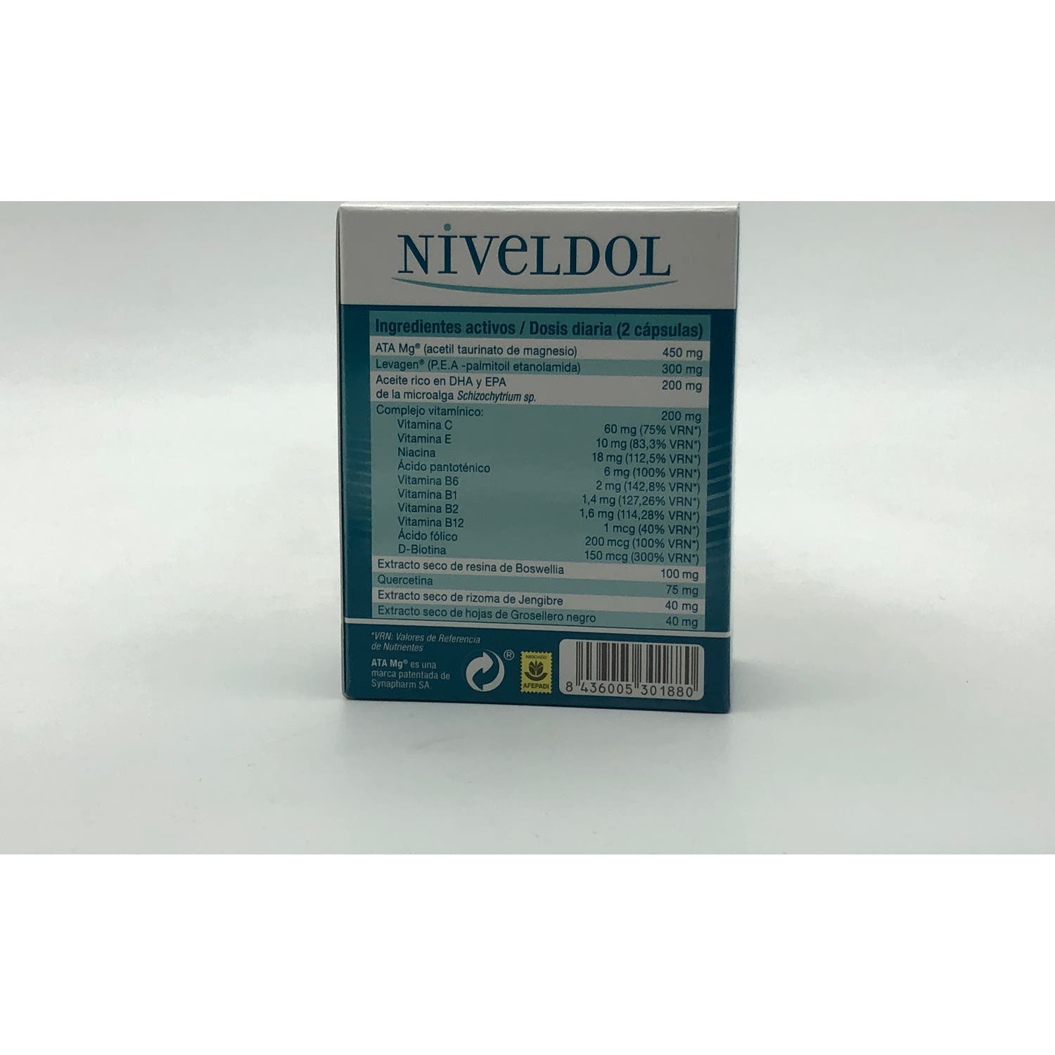 Tongil Niveldol 30caps es un complemento alimenticio a base de Levagen® (P.E.A -palmitoil etanolamida-), ATA Mg® (acetil taurinato de magnesio), DHA y EPA, quercetina, extractos secos de Boswellia serrata, Jengibre y Grosellero negro, y complejo vitamínico del grupo B.