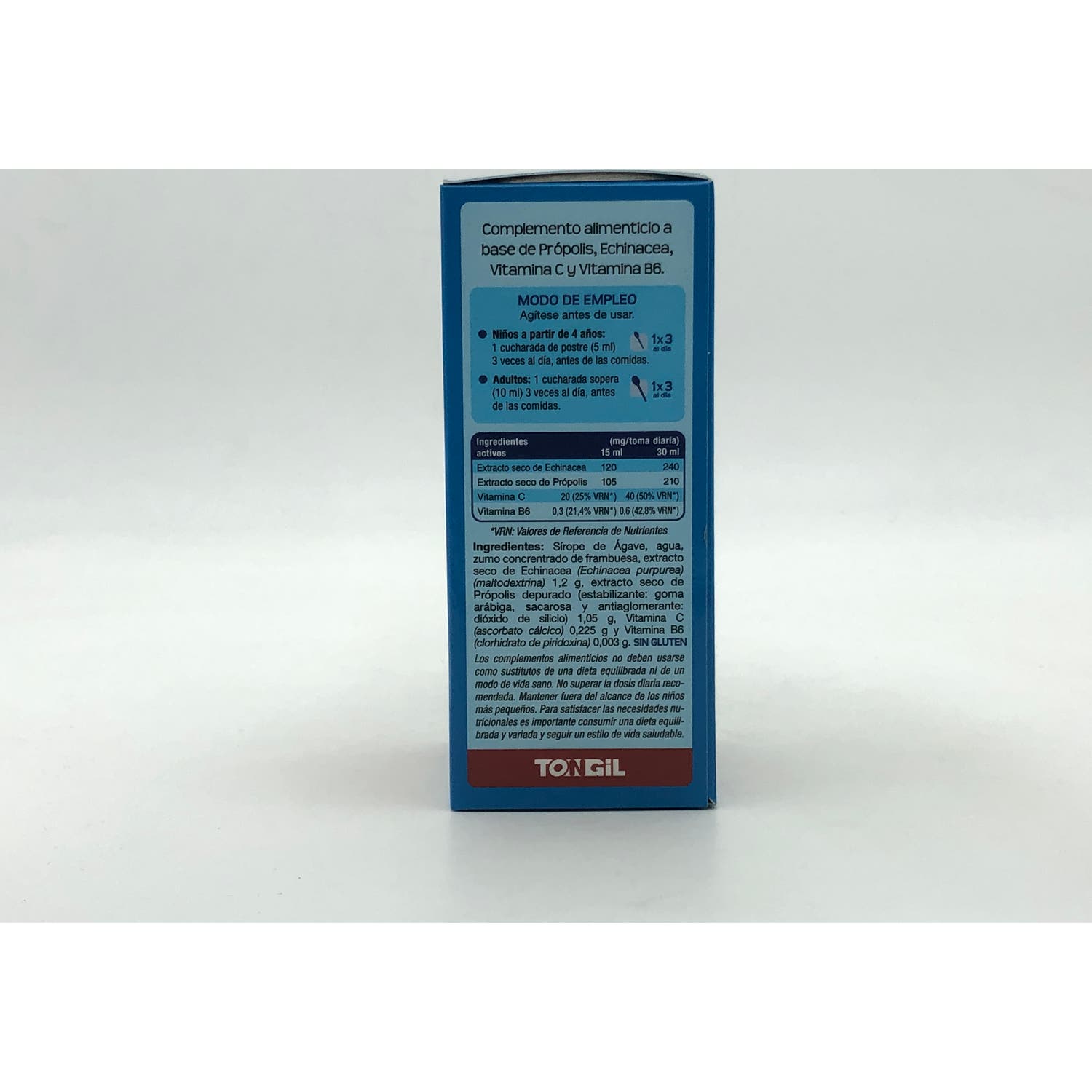 Extracto seco de Echinacea (Echinacea purpurea), Extracto seco de Própolis, Vitamina C (ascorbato cálcico), Vitamina B6 (clorhidrato de piridoxina), Sirope de ágave, agua, zumo concentrado de frambuesa, maltodextrina, estabilizante (goma arábiga, sacarosa), antiaglomerante (dióxido de silicio).