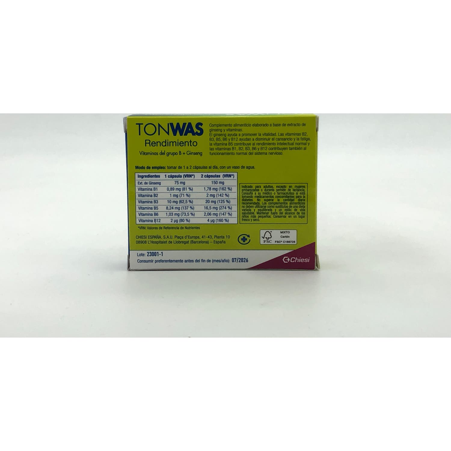 Tonwas Rendimiento 30caps es un complemento alimenticio en cápsulas formulado con un complejo de vitaminas B y ginseng que son útiles en caso de desnutrición, dietas de adelgazamiento, convalecencia o fatiga física.