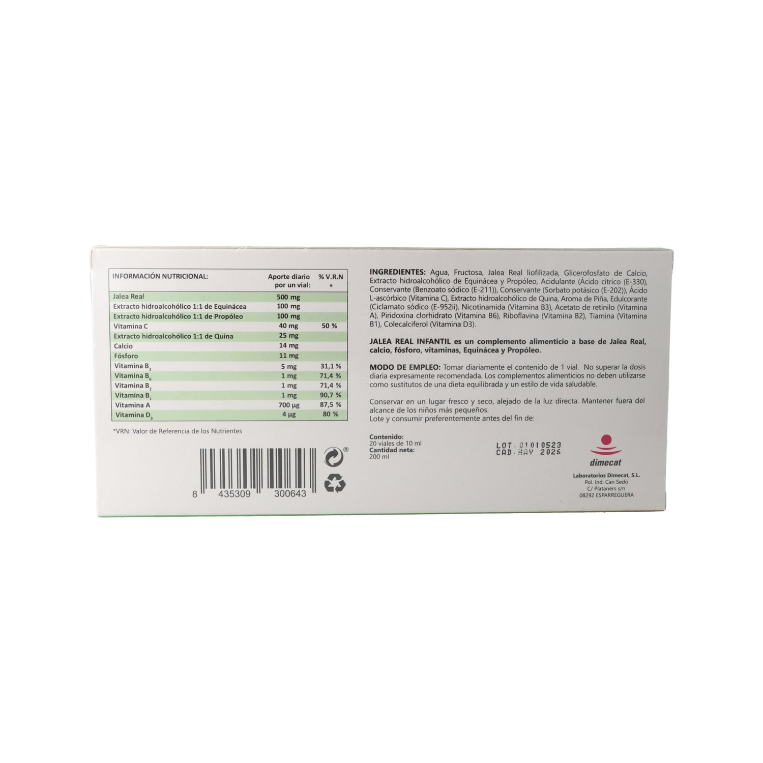 Jalea real que ayuda a estimular y tonificar, además de prevenir los catarros y gripes. Mejora el estado general, aumenta las defensas naturales del organismo, y acorta el período de convalecencia de la gripe y estados catarrales. Ayuda en la falta de apetito, bajo rendimiento en los estudios y alteraciones en el crecimiento.