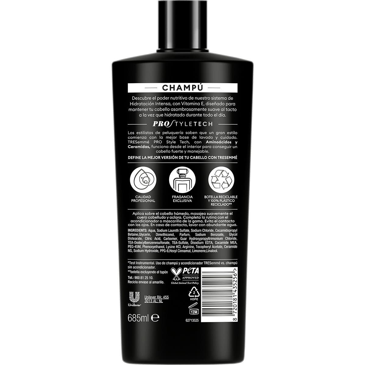 TRESemmé Intensa Hidratación Champú 685ml es un champú de calidad profesional que proporciona una suavidad notable al tacto y una hidratación continua a lo largo del día. Su fórmula, denominada PROSTYLE TECH, está formulada con aminoácidos y ceramidas, lo que lo convierte en una opción ideal para el cabello seco o dañado.