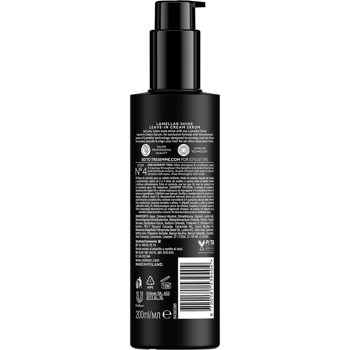 TRESemmé Lamellar Shine Ultra Brillo Sérum Crema Capilar es un producto diseñado para revitalizar el cabello apagado o sin vida, logrando un acabado brillante y luminoso. Este sérum crema forma parte de la rutina de brillo Lamellar Shine, la cual utiliza una tecnología avanzada que envuelve las fibras capilares, corrigiendo, suavizando y alineando el cabello para conseguir un resplandor extraordinario.