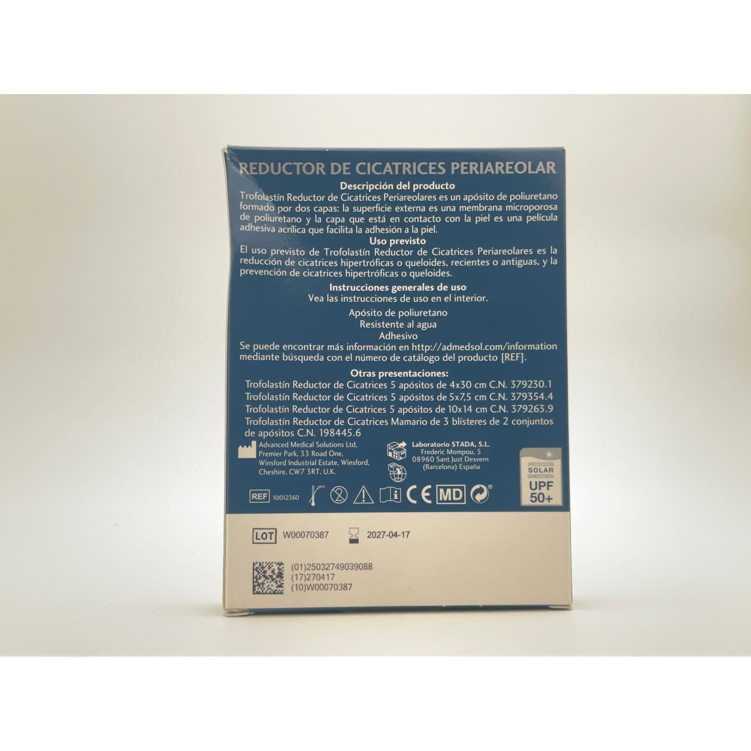Trofolastín Reductor de Cicatrices Periareolar 3x2uds son apósitos indicados para la reducción de cicatrices de carácter hipertrófico, ya sean recientes o antiguas, o bien en caso de queloides.