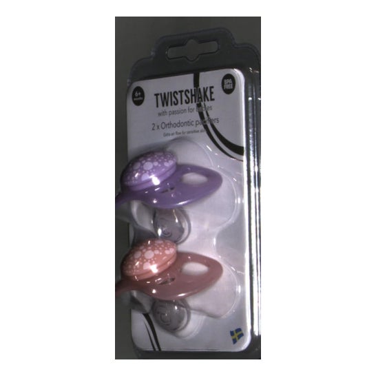 Pack Twistshake Chupetes Rosa Morado +6 Meses son 2 chupetes de moderno diseño con tetina anatómica y orificios de ventilación que dejan salir el aire para mantener la piel de alrededor seca y reducir el riesgo de producir rojeces o irritaciones.