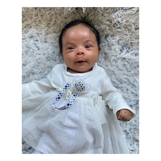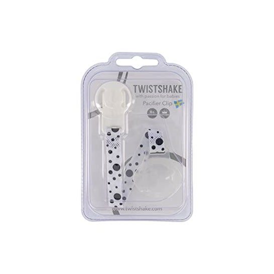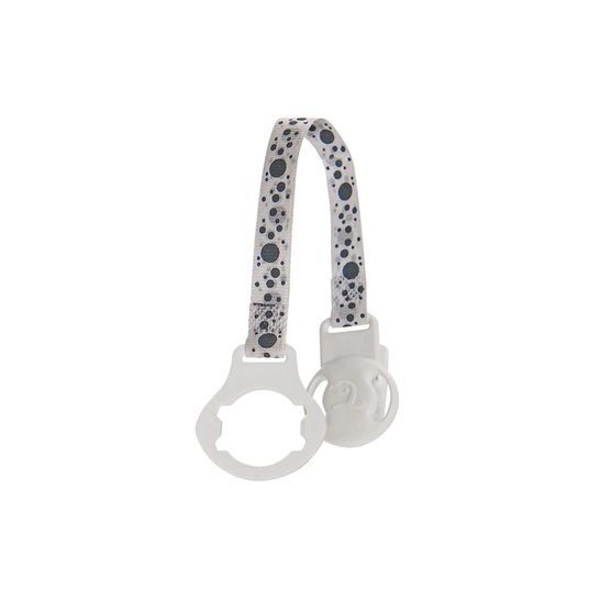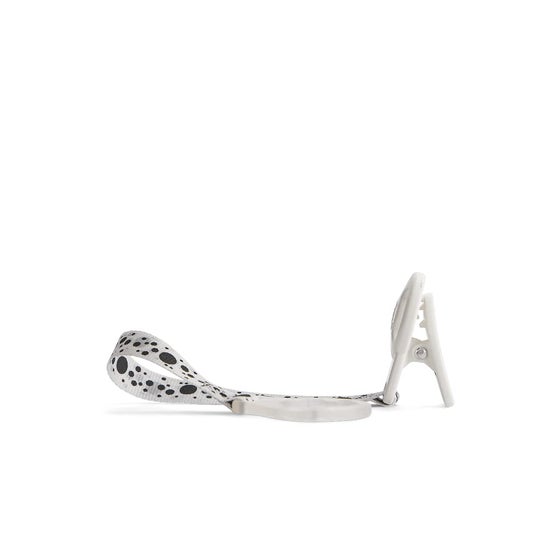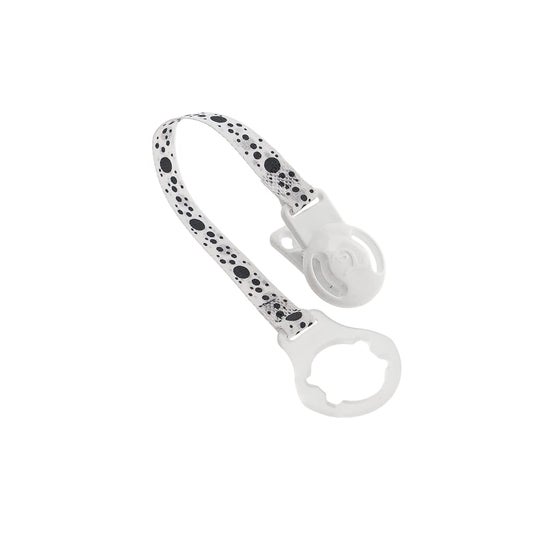 Sujetachupetes diseñado en un divertido estampado en blanco y negro que está equipado con una cinta y un clip, que permite enganchar el chupete a la ropa del bebé, reduciendo el riesgo de perderlo o que caiga al suelo y contraiga bacterias o virus que puedan perjudicar su salud. Es compatible con todos los chupetes. *El color y diseño del producto pueden variar según la disponibilidad.