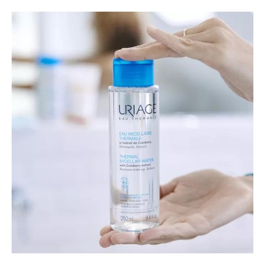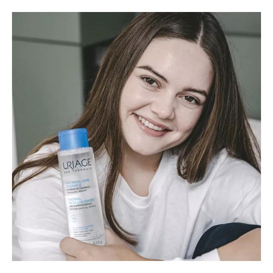 Producto cosmético en formato líquido elaborado a base de agua micelar de origen termal y extracto de arándano que facilitan el desmaquillado del rostro y el contorno de los ojos. Ayuda a limpiar la tez, a la vez que reduce el exceso de sebo, desechos e impurezas faciales. Actúa atrayendo las partículas de suciedad. La composición es compatible con todos los tipos de epidermis y está indicada en las pieles normales y secas.
