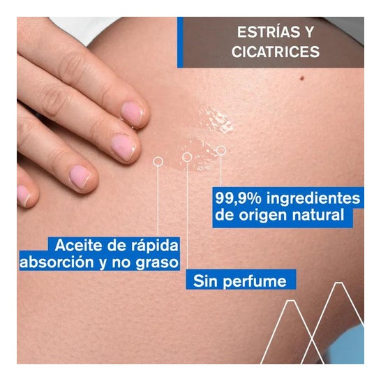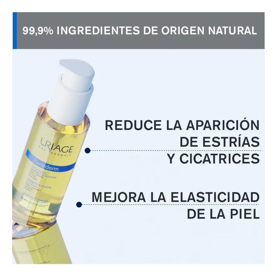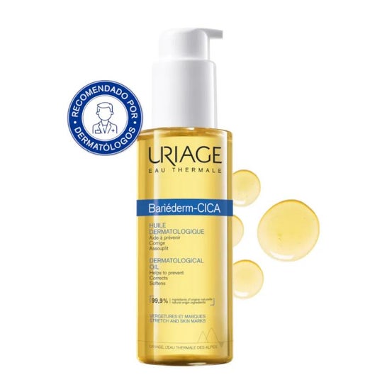Uriage Bariéderm Cica-Huile Dermatologique 100ml es un aceite que mejora la elasticidad y el tono de la piel para ayudar a limitar la aparición de estrías. Gracias a la patente GF-Repair y a su formulación con un 99,9% de ingredientes de origen natural, previene y corrige la aparición de estrías (color y tamaño). Enriquecido con aceites de jojoba, aguacate y girasol, ricos en polifenoles, carotenoides, vitaminas C y E, y omega-6, favorece la reparación, nutre intensamente la piel al tiempo que la suaviza.Especialmente diseñado para masajear estrías y marcas recientes, acompaña a tu cuerpo y sus cambios durante el embarazo, el aumento de peso y el postoperatorio. Se puede utilizar antes, durante y después del embarazo y durante la lactancia, y no contiene perfume ni grasa para vestirse rápidamente.