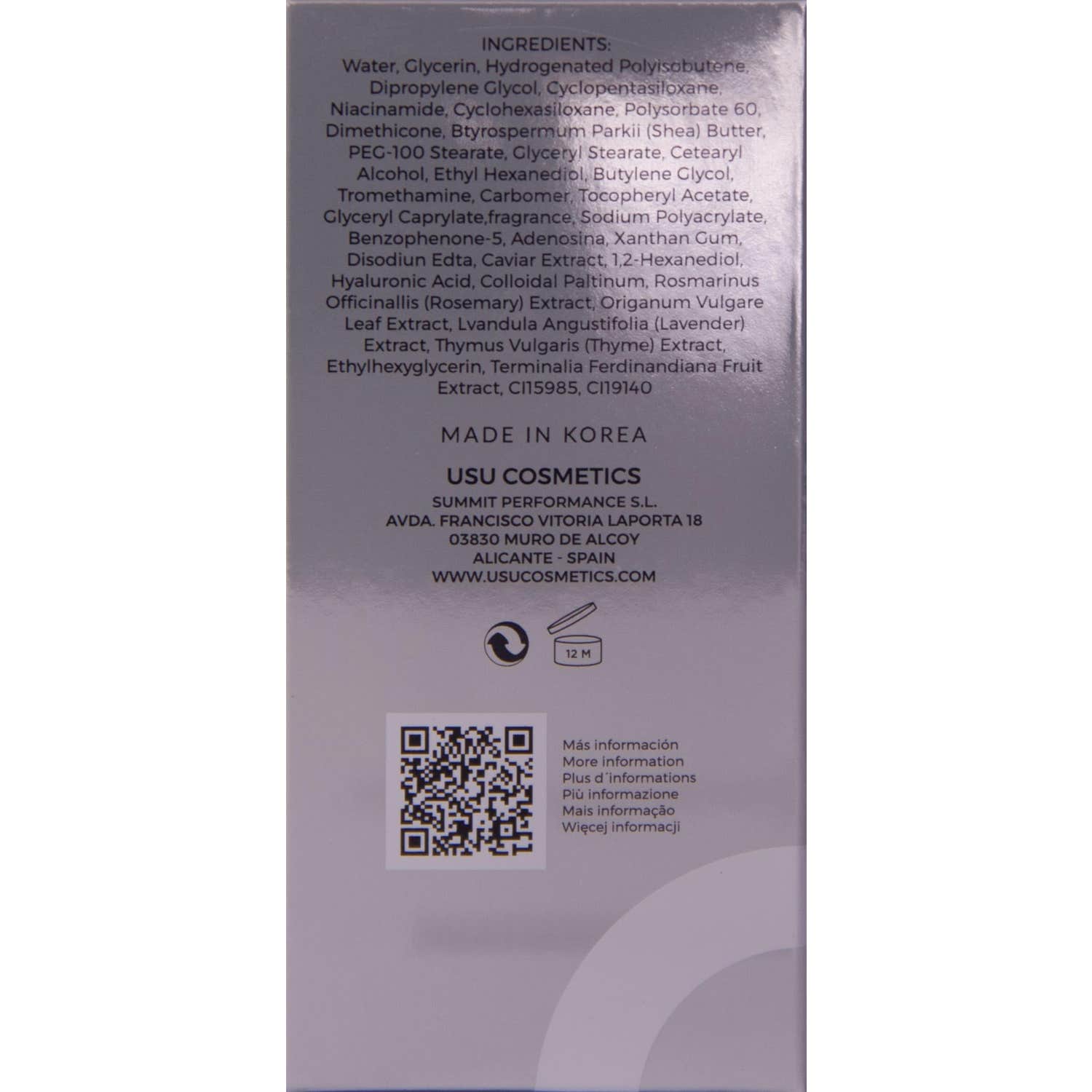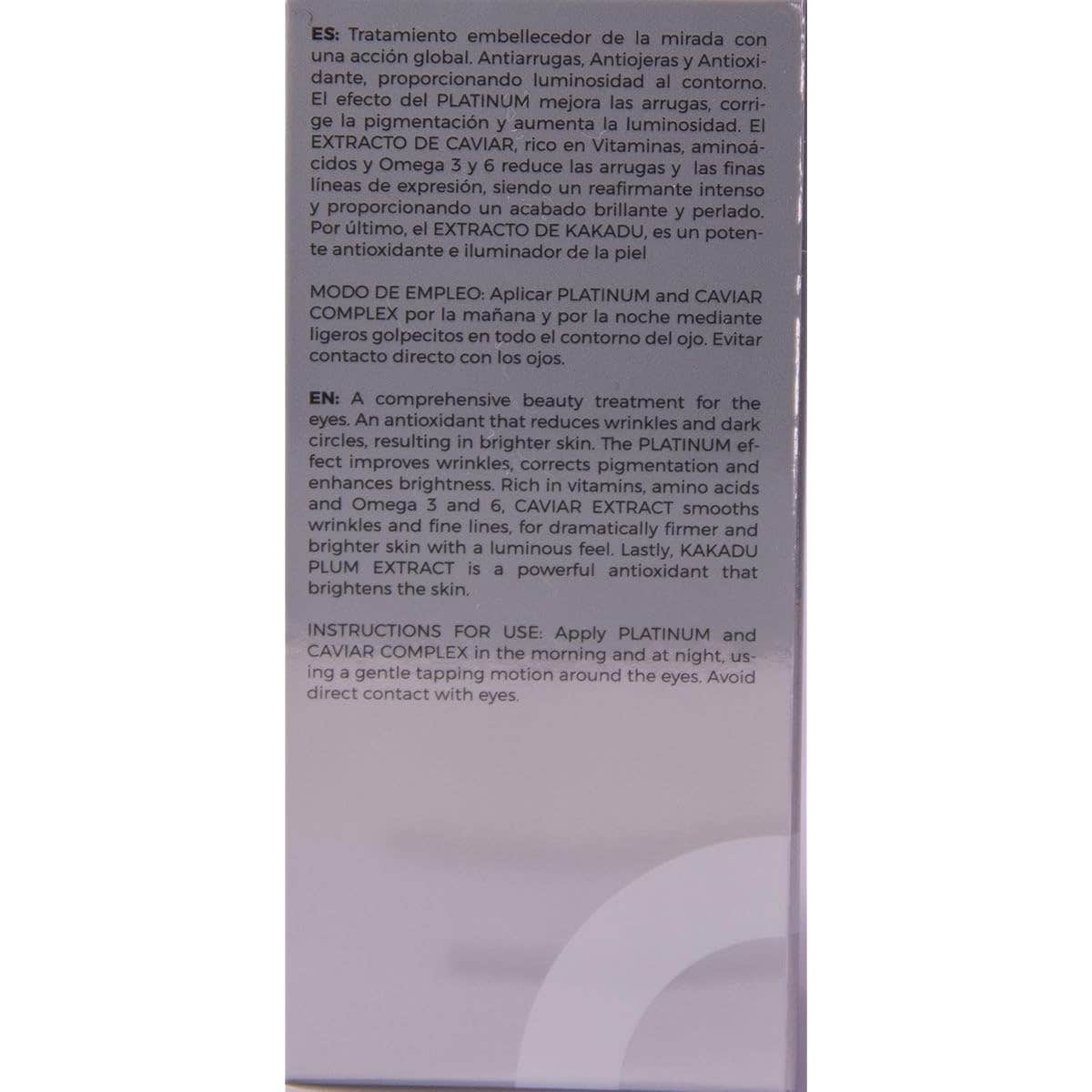 Es un sérum facial elaborado a partir de un complejo activo de caviar. Con acción anti arrugas, ofrece hidratación y luminosidad a la piel. Realza los contornos del rostro. El efecto del platinum ayuda a mejorar las arrugas, corregir la pigmentación y aumentar la luminosidad. El extracto de caviar, rico en vitaminas, aminoácidos y omega 3 y 6 es un reafirmante intenso con un acabado brillante y perlado. Con extracto de kadaku, es un potente antioxidante e iluminador de la piel. Indicado para todo tipo de piel.