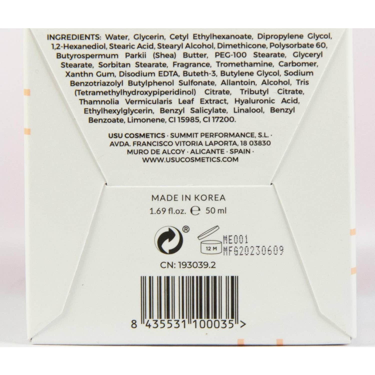 Water, Glycerin, Cetyl Ethylhexanoate, Dipropylene Glycol, 1,2-Hexanediol, Stearic Acid, Stearyl Alcohol, Dimethicone, Polysorbate 60, Butyrospermum Parkii (Shea) Butter, Peg‑100 Stearate, Glyceryl Stearate, Sorbitan Stearate, Fragrance, Tromethamine, Carbomer, Xanthn Gum, Disodium EDTA, Buteth-3, Butylene Glycol, Sodium Benzotriazolyl Butylphenol Sulfonate, Allantoin, Alcohol, Tris(Tetramethylhydroxypiperidinol) Citrate, Tributyl Citrate, Thamnolia Vermicularis Leaf Extract, Hyaluronic Acid, Ethylhexylglycerin, Benzyl Salicylate, Linalool, Benzyl Benzoate, Limonene, CI15985, CI 17200.