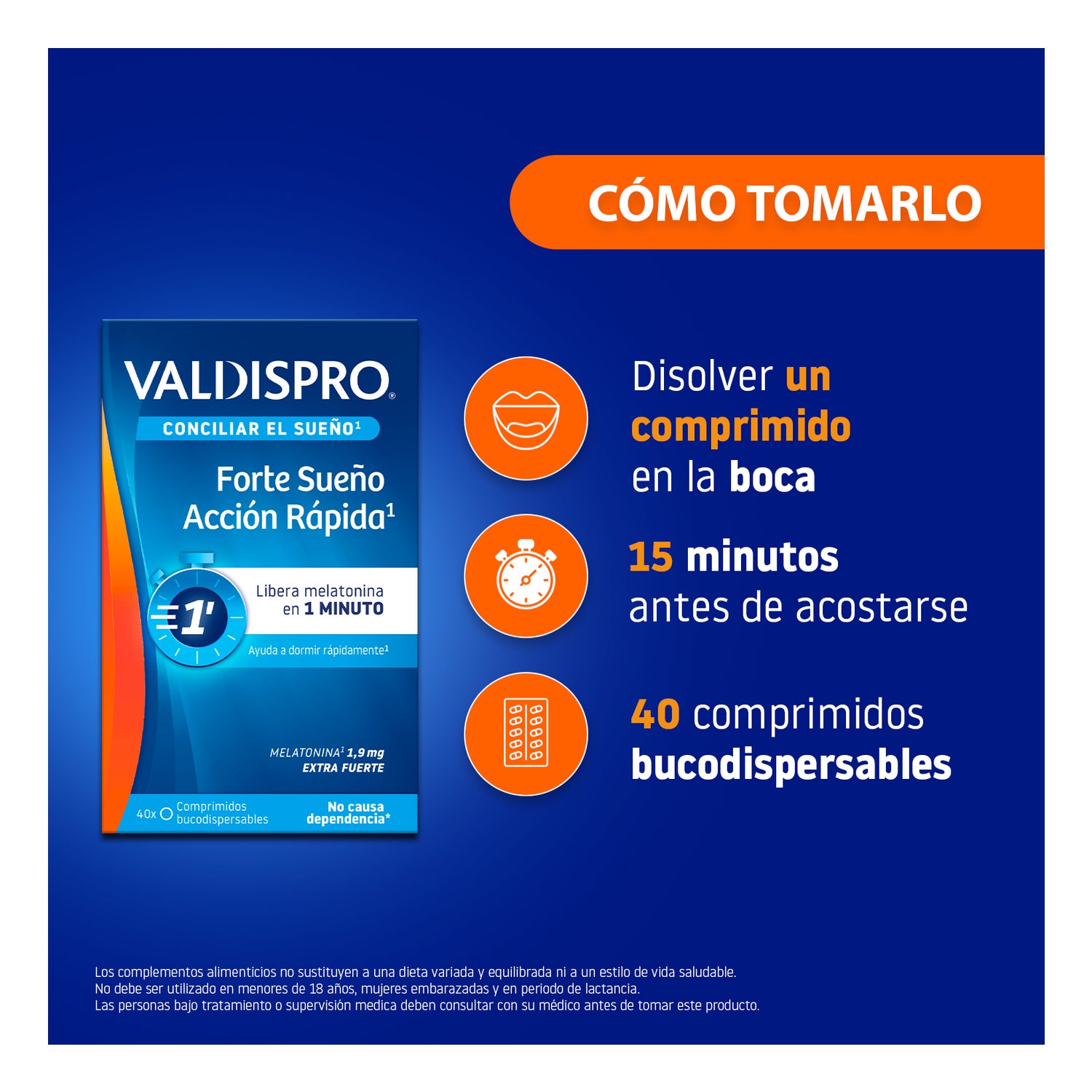 Tomar 1 comprimido 15 minutos antes de acostarse. Sin agua, dejar que el comprimido se disuelve en la boca.