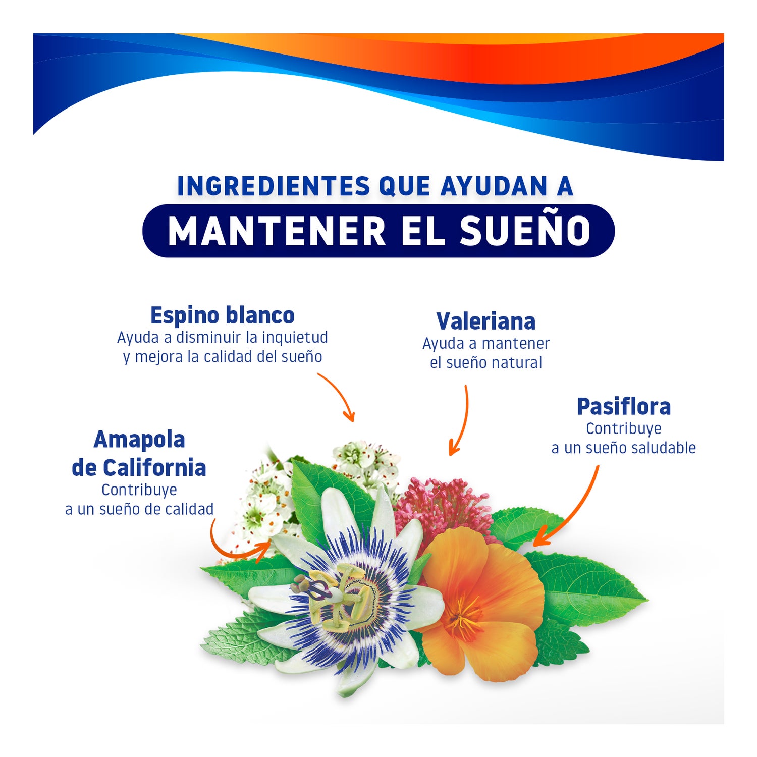 Su sistema de liberación prolongada ayuda a optimizar el sueño y a que éste sea más profundo. Asimismo, está formulado con pasiflora, espino blanco, valeriana y amapola de california, elementos que ayudan a optimizar el sueño y a reducir la agitación.
