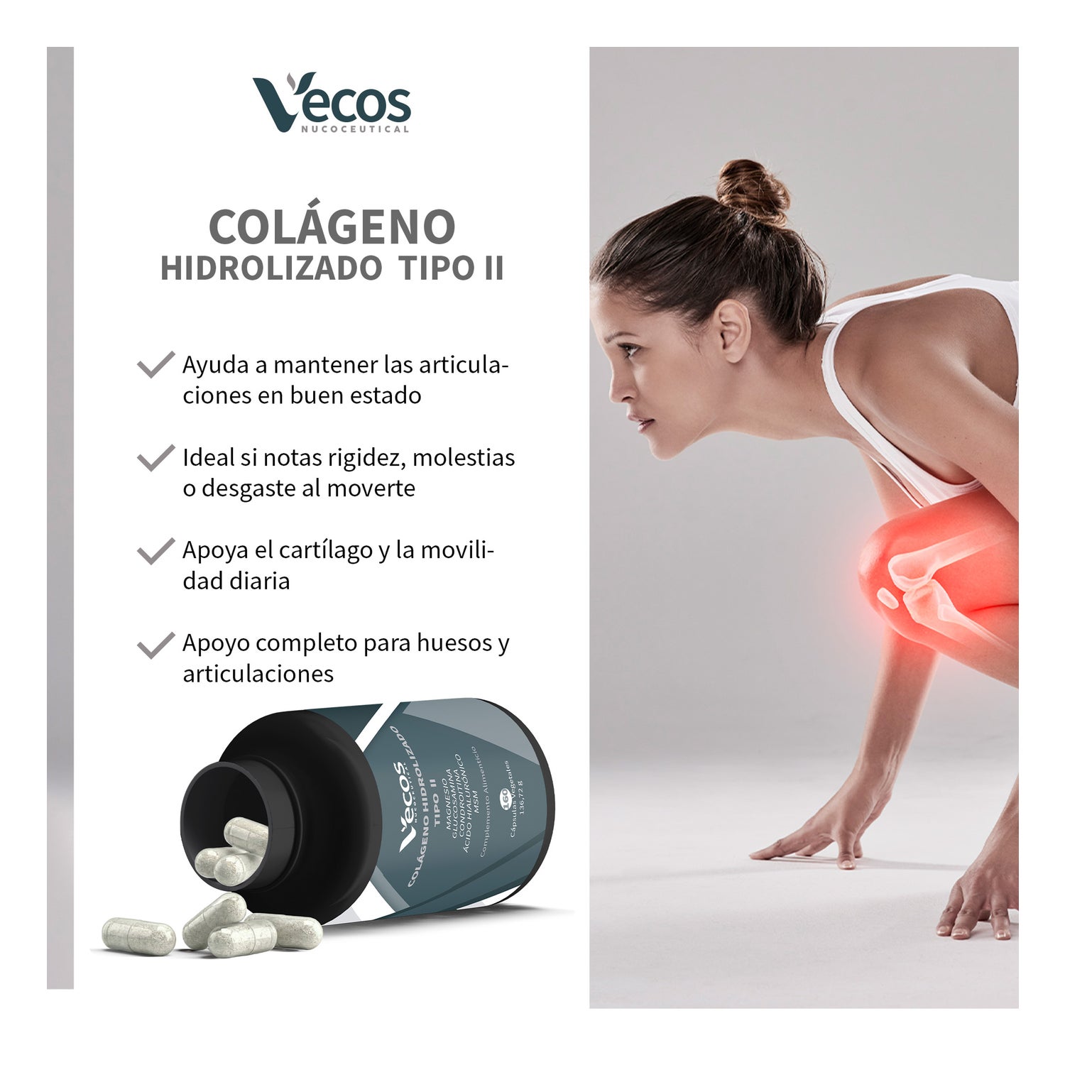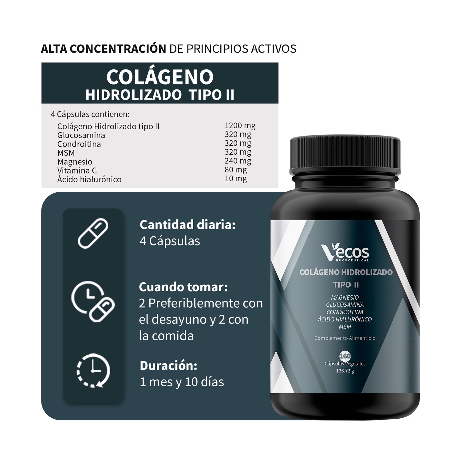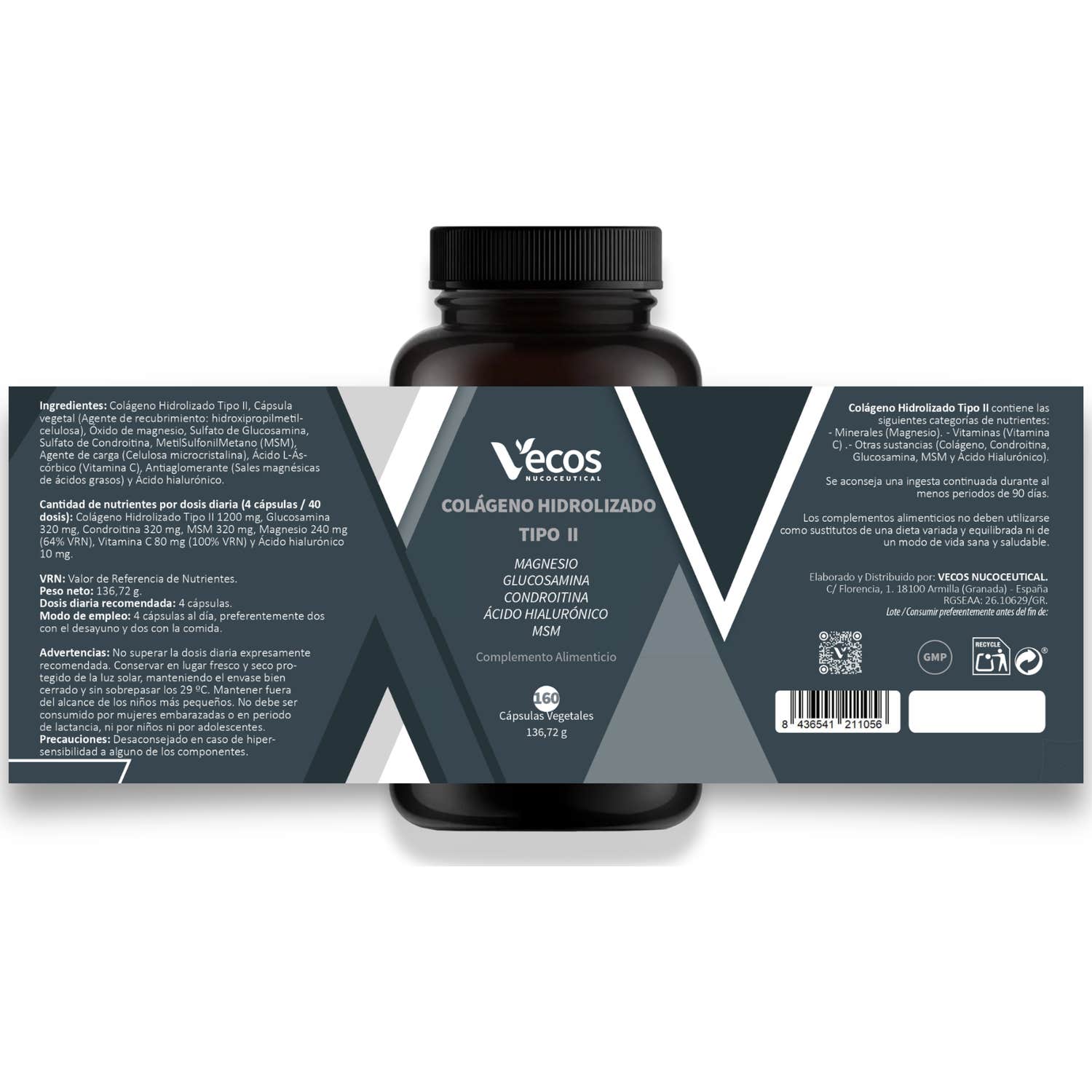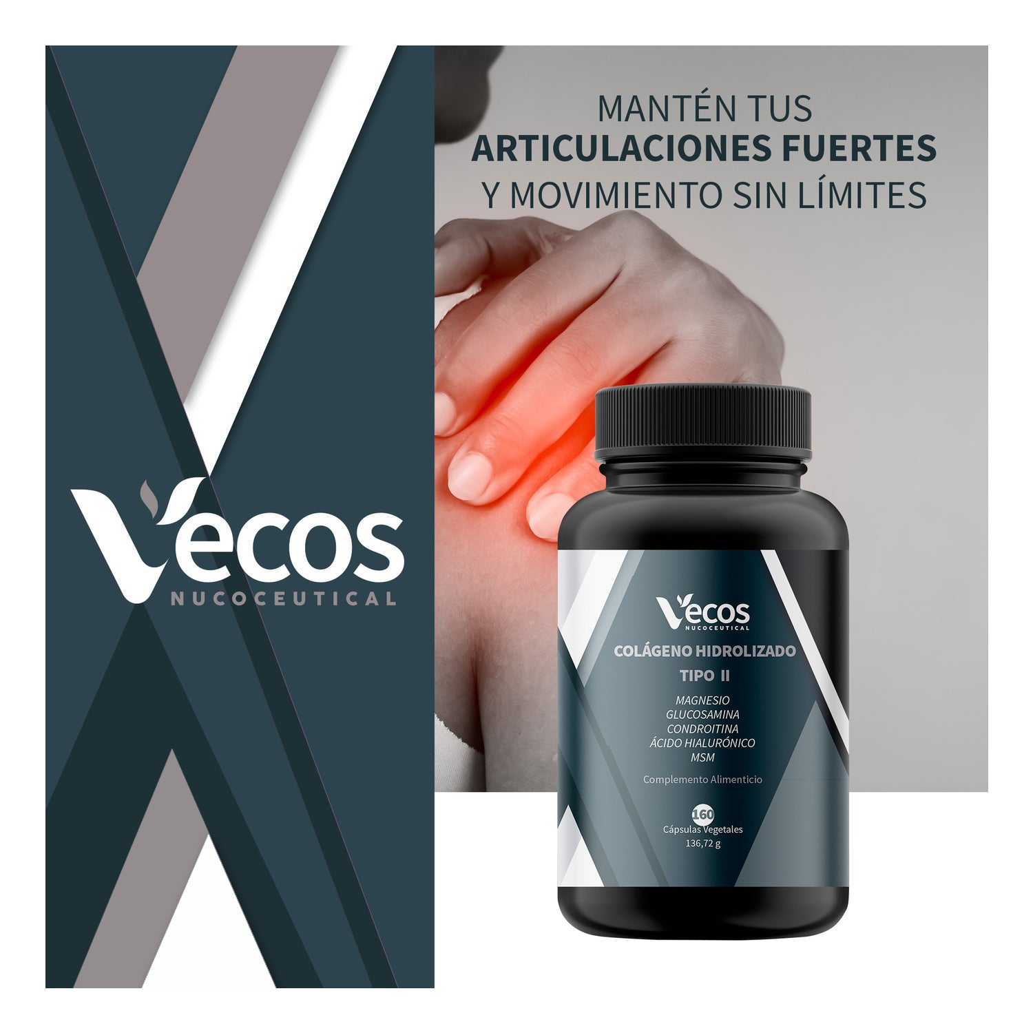 Vecos Nucoceuticals Colágeno Hidrolizado Tipo II 160caps es un complemento alimenticio formulado con colágeno tipo II, ácido hialurónico y vitamina C. Favorece el mantenimiento normal de las articulaciones y contribuye a prevenir el desgaste del cartílago.
