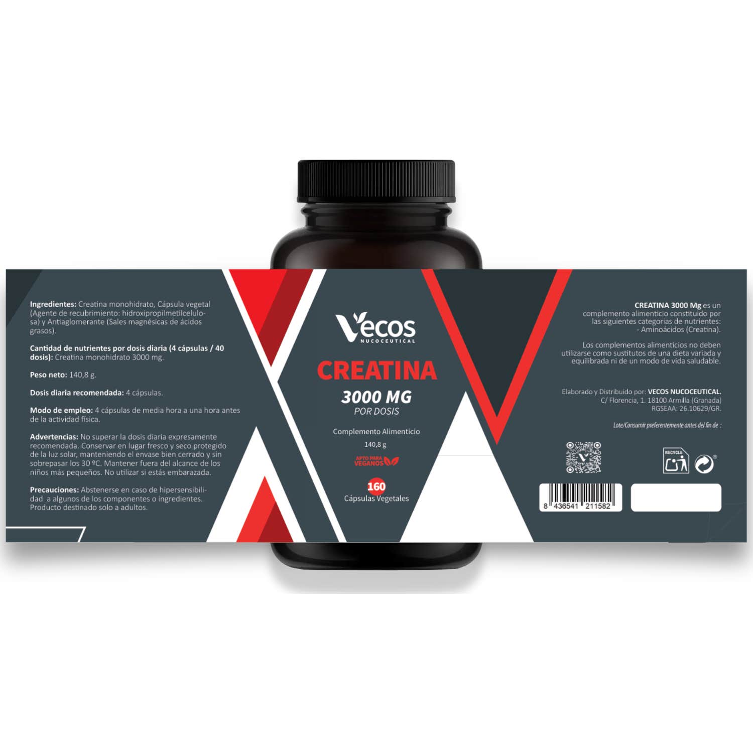 Vecos Nucoceuticals Creatina 3000mg 160caps es un complemento alimenticio formulado con creatina en cápsulas vegetales.