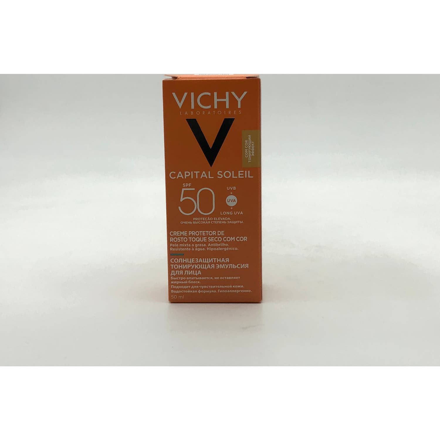 Vichy Capital Soleil Emulsión Facial Tacto Seco con Color SPF50+ 50ml es un producto de la gama Idéal Soleil que aporta una alta protección para la piel del rostro, en mujeres con pieles de mixtas a grasas. Esta emulsión además proporciona un toque de color que ilumina la piel al instante, dando un efecto de bronceado natural.