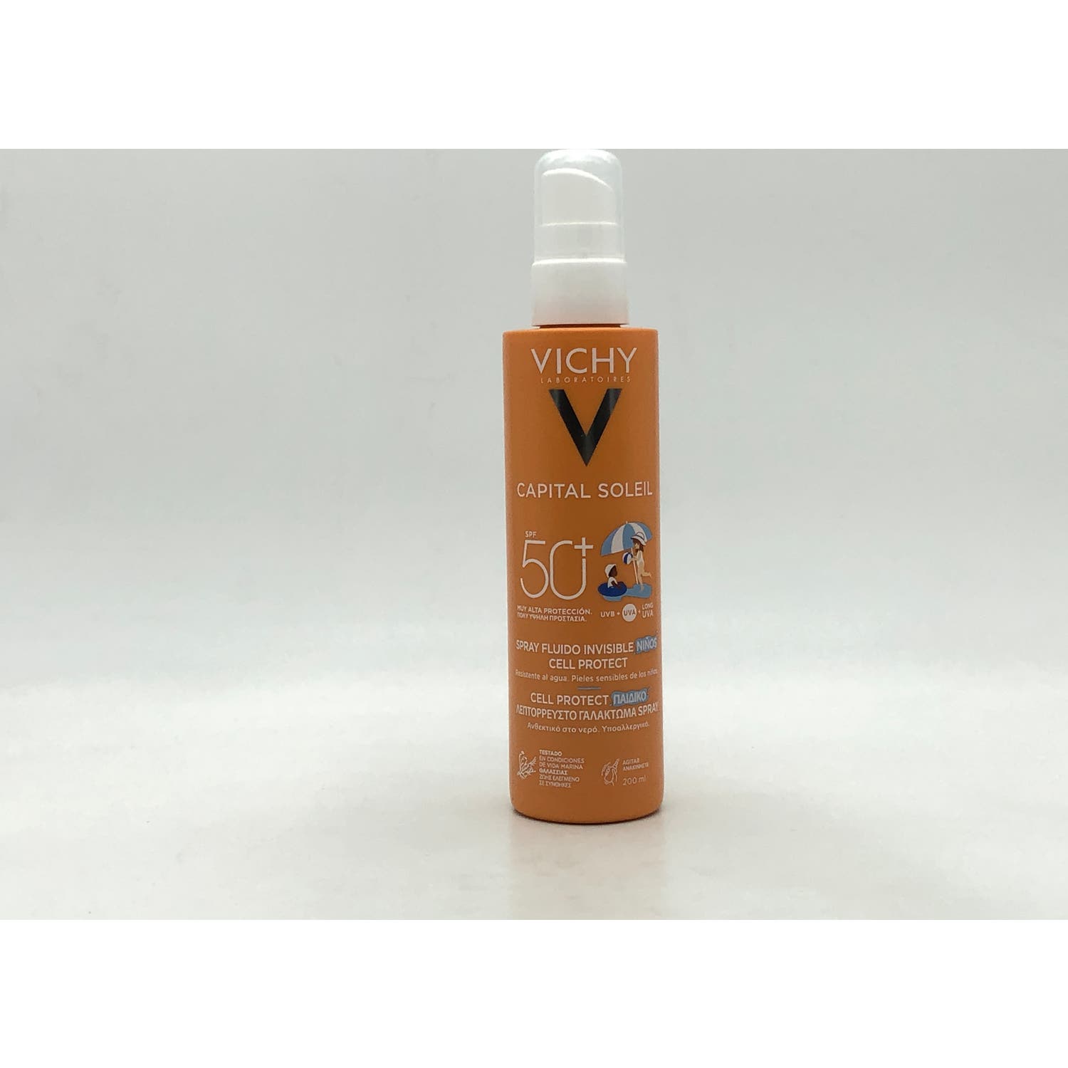 Vichy Capital Soleil Kids Cell Protect Water Fluid Spray SPF50+ 200ml es un spray solar infantil defensa anti-uva a prueba de roces, fricciones y chapuzones.