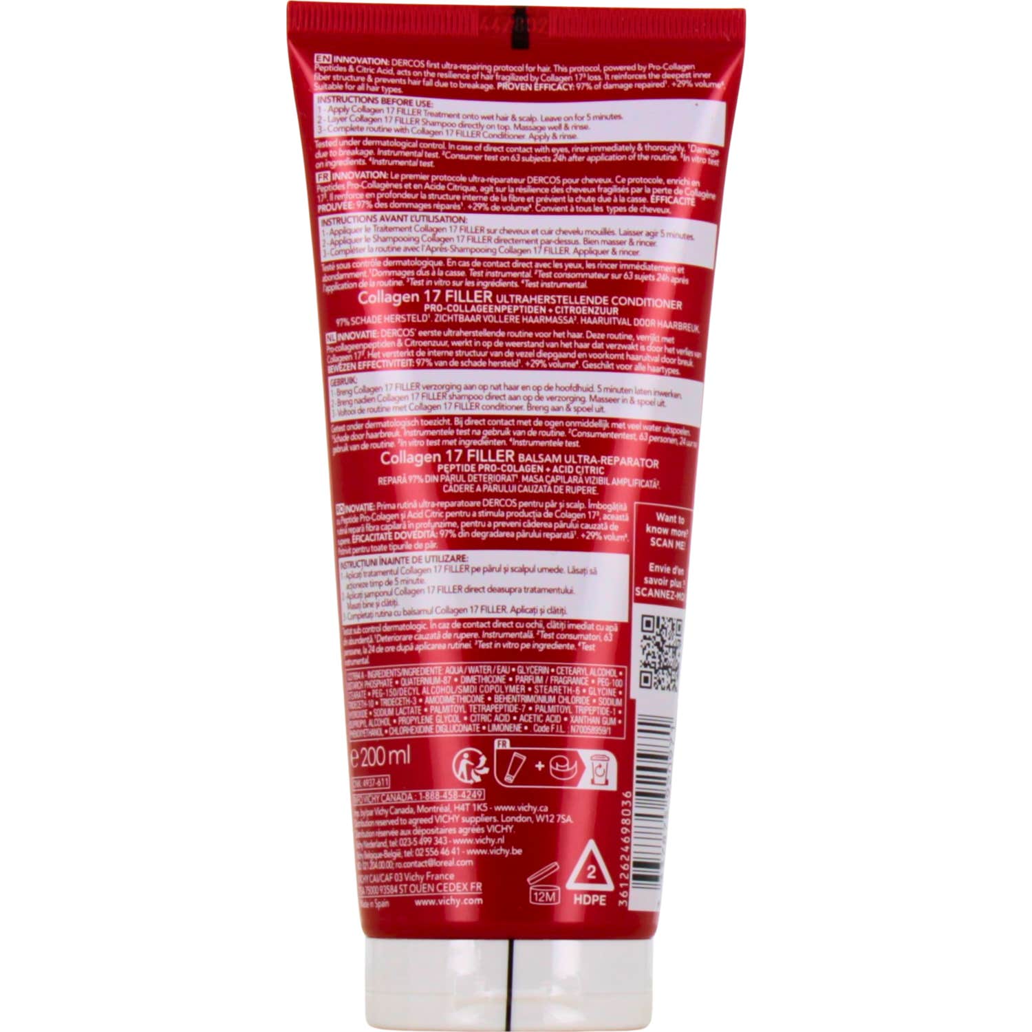 El Acondicionador Ultra-Reparador Collagen 17 Filler contribuye a revitalizar el cabello, proporcionando volumen y densidad. Su efectividad ha sido clínicamente probada, logrando que la fibra capilar sea diez veces más fuerte y aumentando el volumen en un 53%. Este producto es la última etapa del protocolo anti-rotura DERCOS Collagen 17 Filler, que incluye fórmulas enriquecidas con: