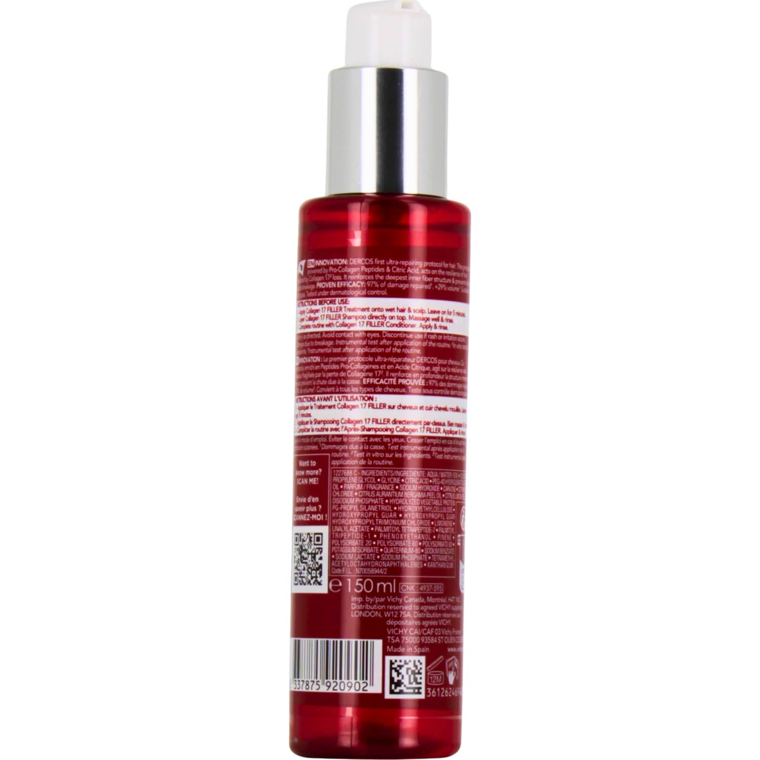 Vichy Dercos Collagen Filler 17 Pre Champú es un producto diseñado para fortalecer la estructura interna del cabello y reducir la fragilidad. Este pre-champú ultra-reparador, de 150 ml, forma parte de la gama DERCOS Collagen 17 Filler, que ofrece un protocolo específico para combatir el daño capilar.