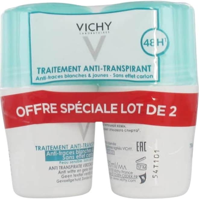 Vichy Tratamiento Antitranspirante 48h Roll-on 2x50ml es un pack de dos desodorantes antitranspirantes ideal para personas que sufren una sudoración intensa. Ofrece suavidad y frescor en la piel