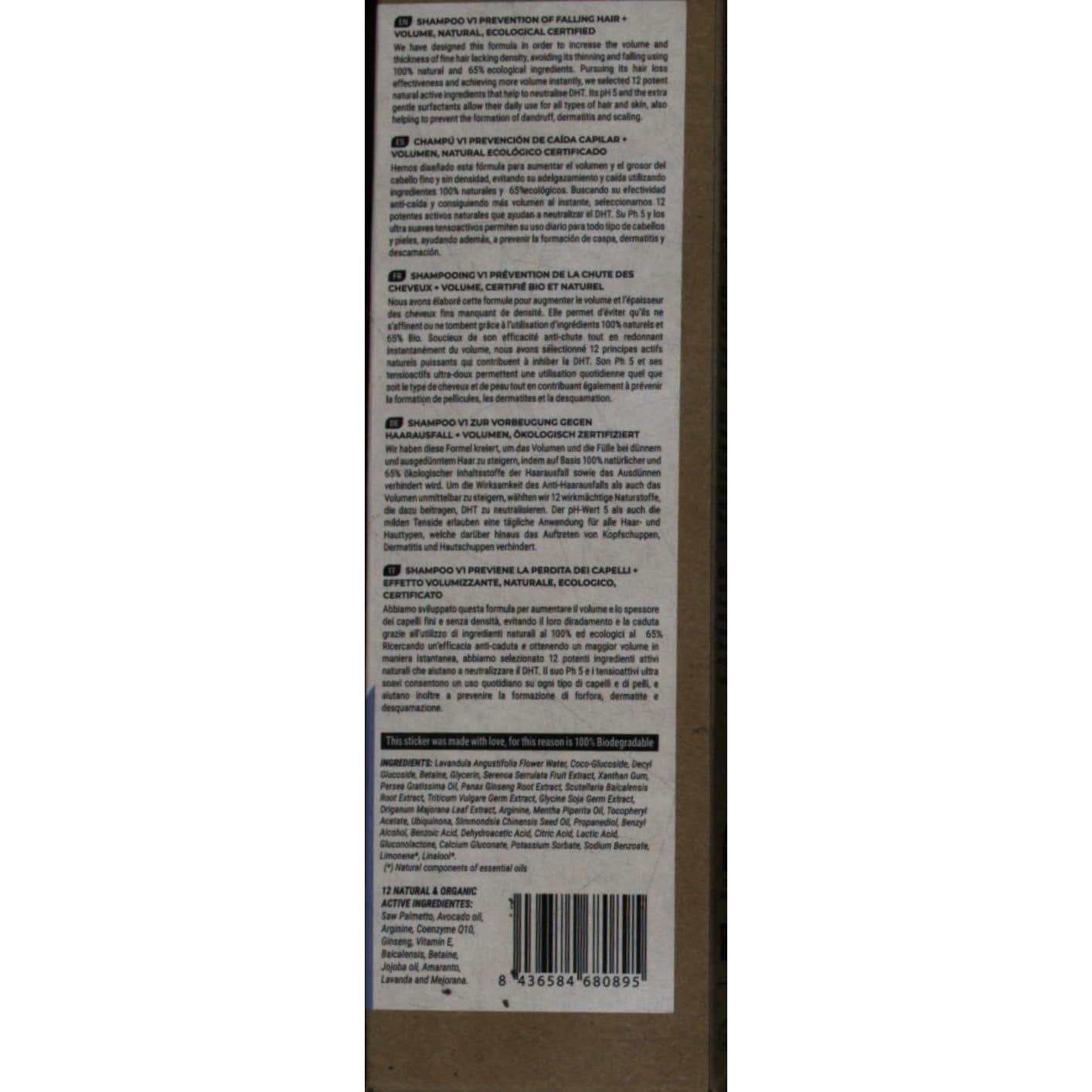 VidalForce Bio Shampoo V1 Prevents Hair Loss Volume 250ml es un champú de efecto anticaída que ayuda a aumentar el volumen y el grosor del cabello fino. Su fórmula está formulada con componentes naturales que ayudan a evitar el adelgazamiento de la fibra capilar. Asimismo, su Ph5 y los tensioactivos que incorpora facilitan la protección del cuero cabelludo para evitar así la generación de caspa o descamación. Formulado sin sulfatos químicos, siliconas, ni colorantes. Botella hecha con caña de azúcar. Apto para cabellos teñidos y pieles hipersensibles. 100% vegano.
