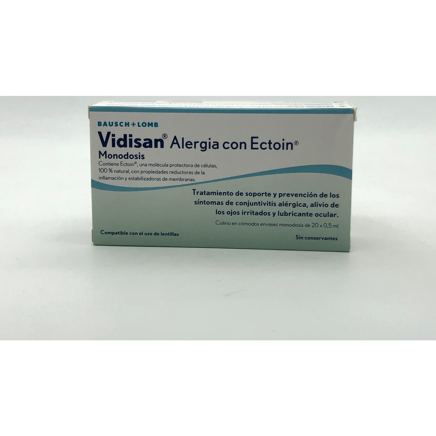 Vidisan Alergia con Ectoin incluye ectoína, un agente que protege a tus ojos frente a la acción de los alérgenos, y ácido hialurónico, que proporciona un efecto calmante y estabilizador de la superficie ocular.