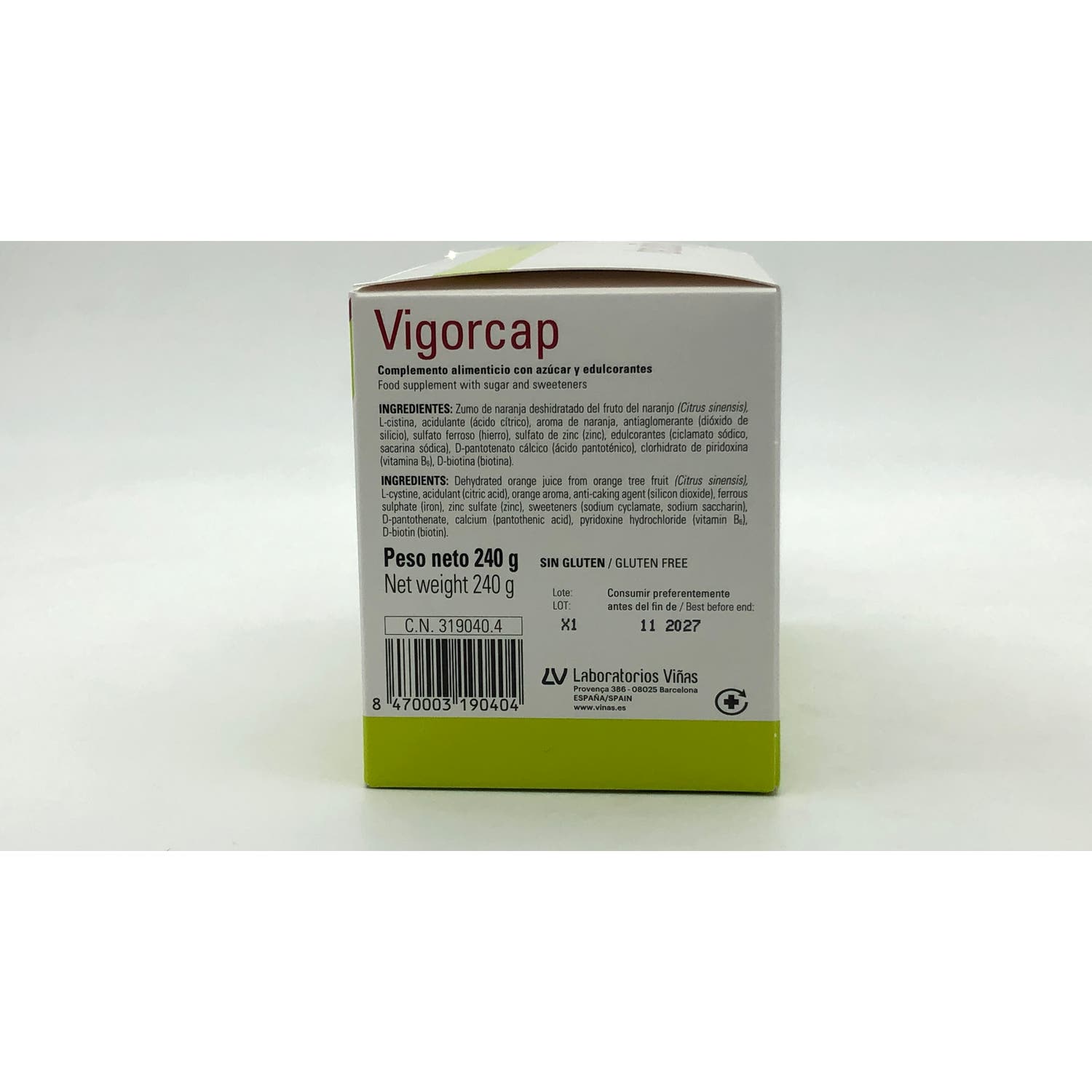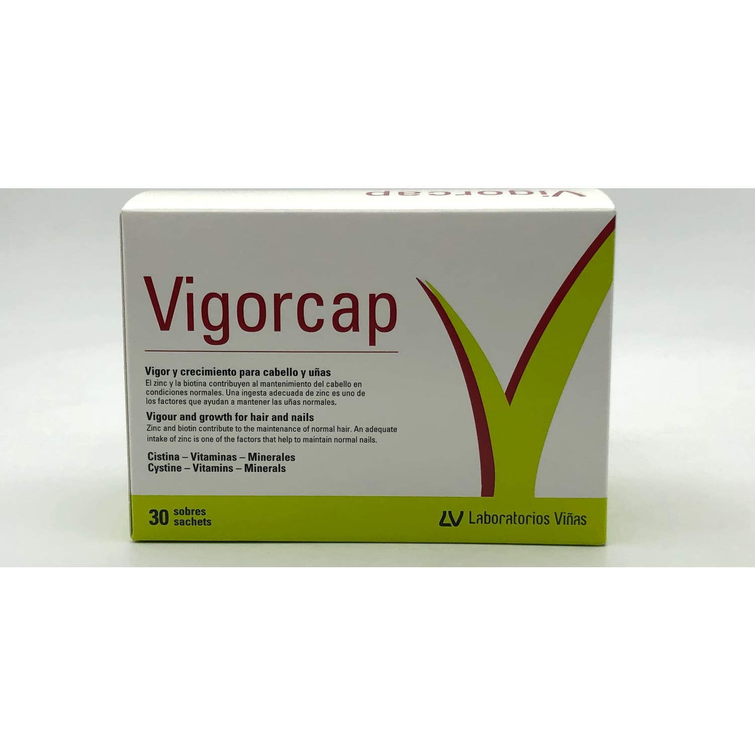 Vigorcap es un complemento nutricional que te ayudará a reforzar el cabello y las uñas gracias a un aporte extra de biotina y de cistina, responsable de la formación de la queratina. Vigorcap también contienen zinc y hierro, que favorecen el crecimiento de unas uñas fuertes. La combinación de todos estros nutrientes reequilibrará la estructura de los cabellos y uñas mejorando su apariencia.