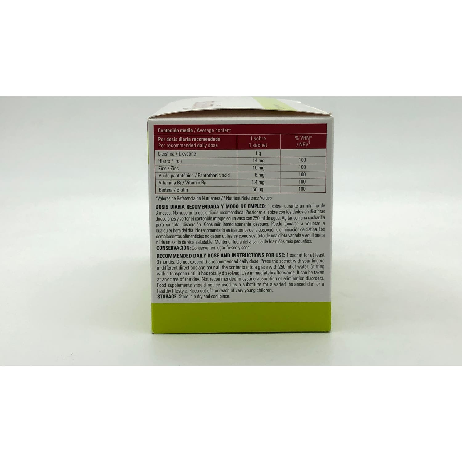 E954 (II) SACARINA SÓDICA. L-CISTINA. ZINC. PANTOTÉNICO ÁCIDO (VIT. B5). PIRIDOXINA 5-FOSFATO (VIT. B6). BIOTINA (VIT. B8). HIERRO. NARANJA DULCE SERENZO (CITRUS SINENSIS).