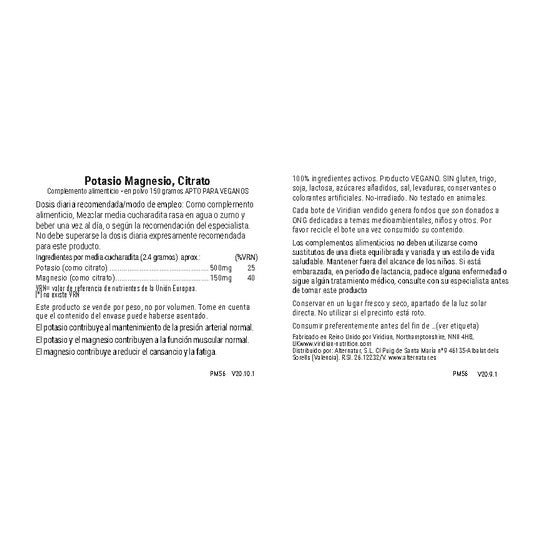 Viridian Potasio Magnesio Citrato Polvo 150g es un complemento alimenticio diseñado para favorecer la salud cardiovascular y muscular. Es ideal para mantener una presión arterial normal y asegurar una función muscular óptima en la vida diaria.