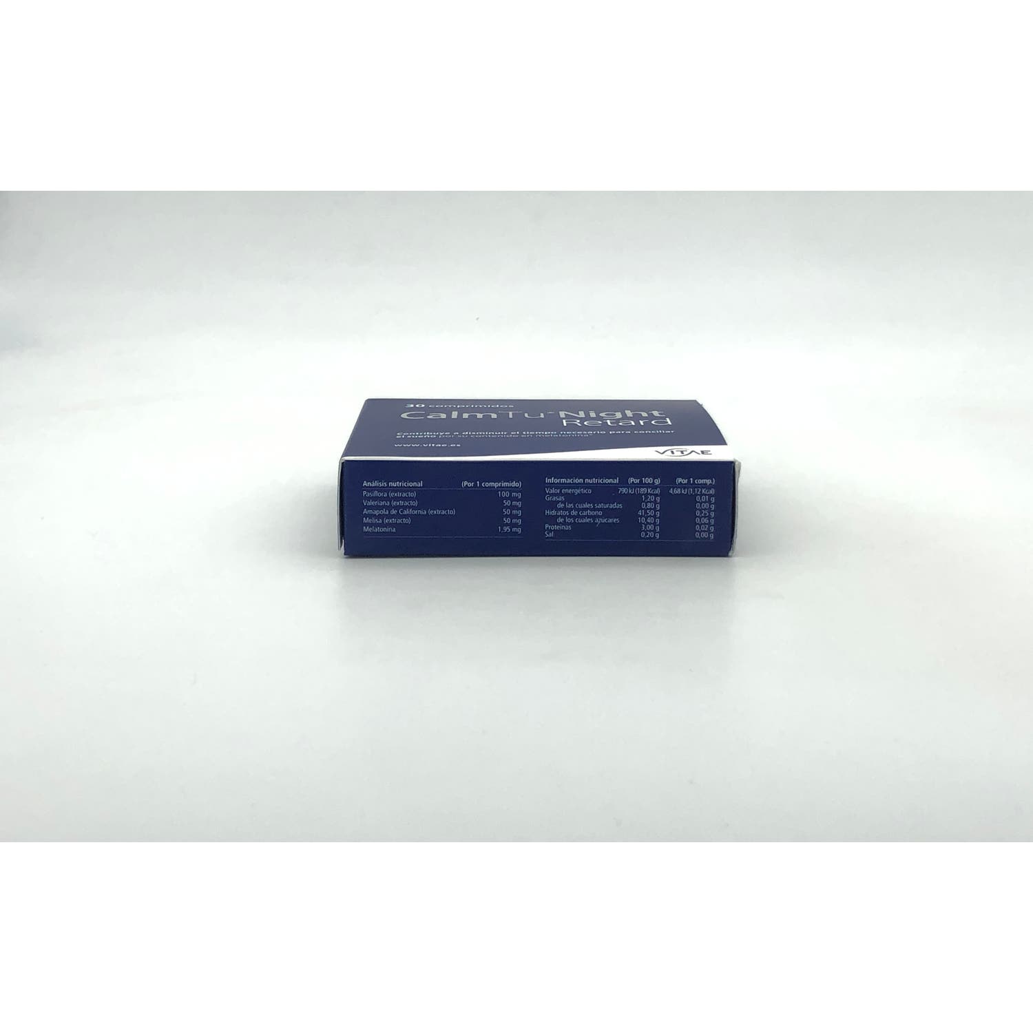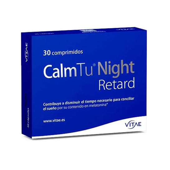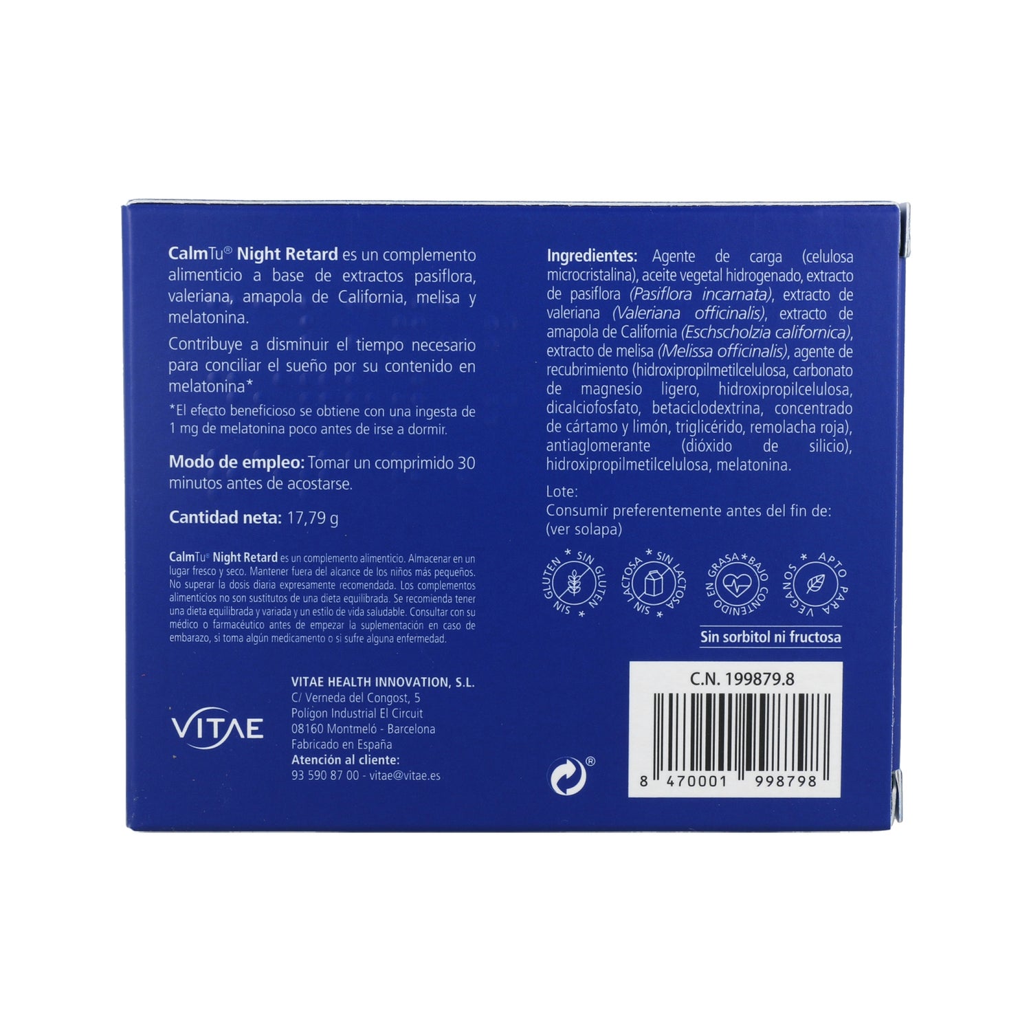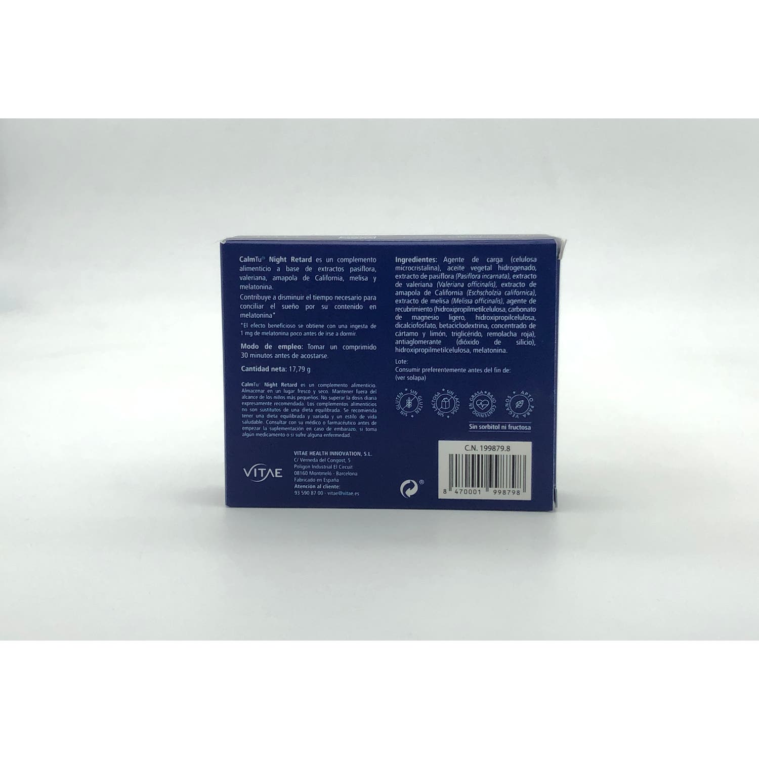 Vitae CalmTu Night Retard 30comp es un complemento alimenticio a base de extractos de valeriana, pasiflora, amapola de California, melisa y melatonina.