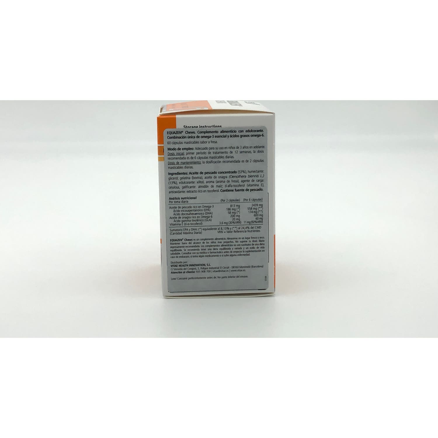 Vitae Equazen Chews Fresa 60caps son cápsulas masticables con sabor a fresa que contienen ácidos grasos omega 3 y 6 que ayudan al desarrollo intelectual y la conexión neuronal.