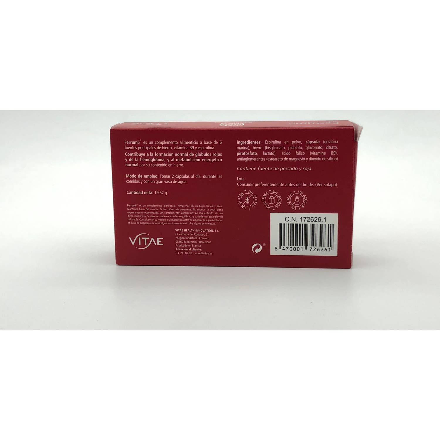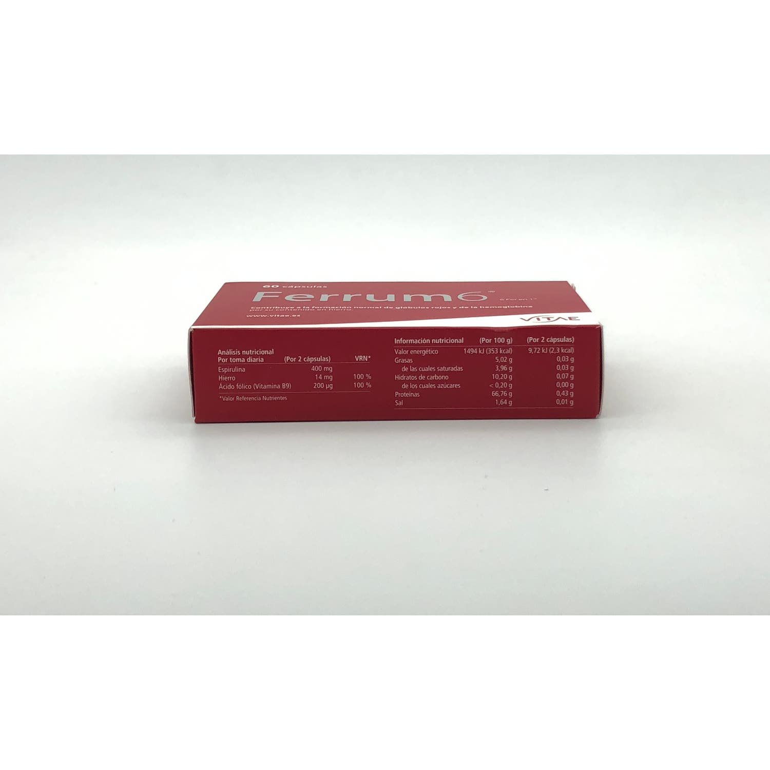 Vitae Ferrum6 60caps es un suplemento formulado con 6 fuentes distintas de hierro (bisglicinato, pidolato, citrato, gluconato, pirofosfato, lactato), ácido fólico y espirulina.