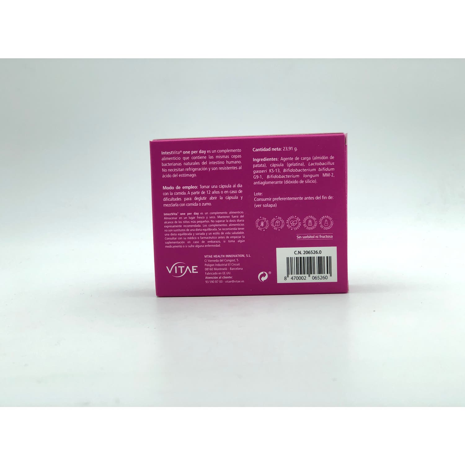 Vitae IntestVita One per Day 30caps es un complemento alimenticio que ayuda a regenerar la flora intestinal. Incluye probióticos para equilibrar la salud del intestino. No contiene gluten, lactosa o grasas.