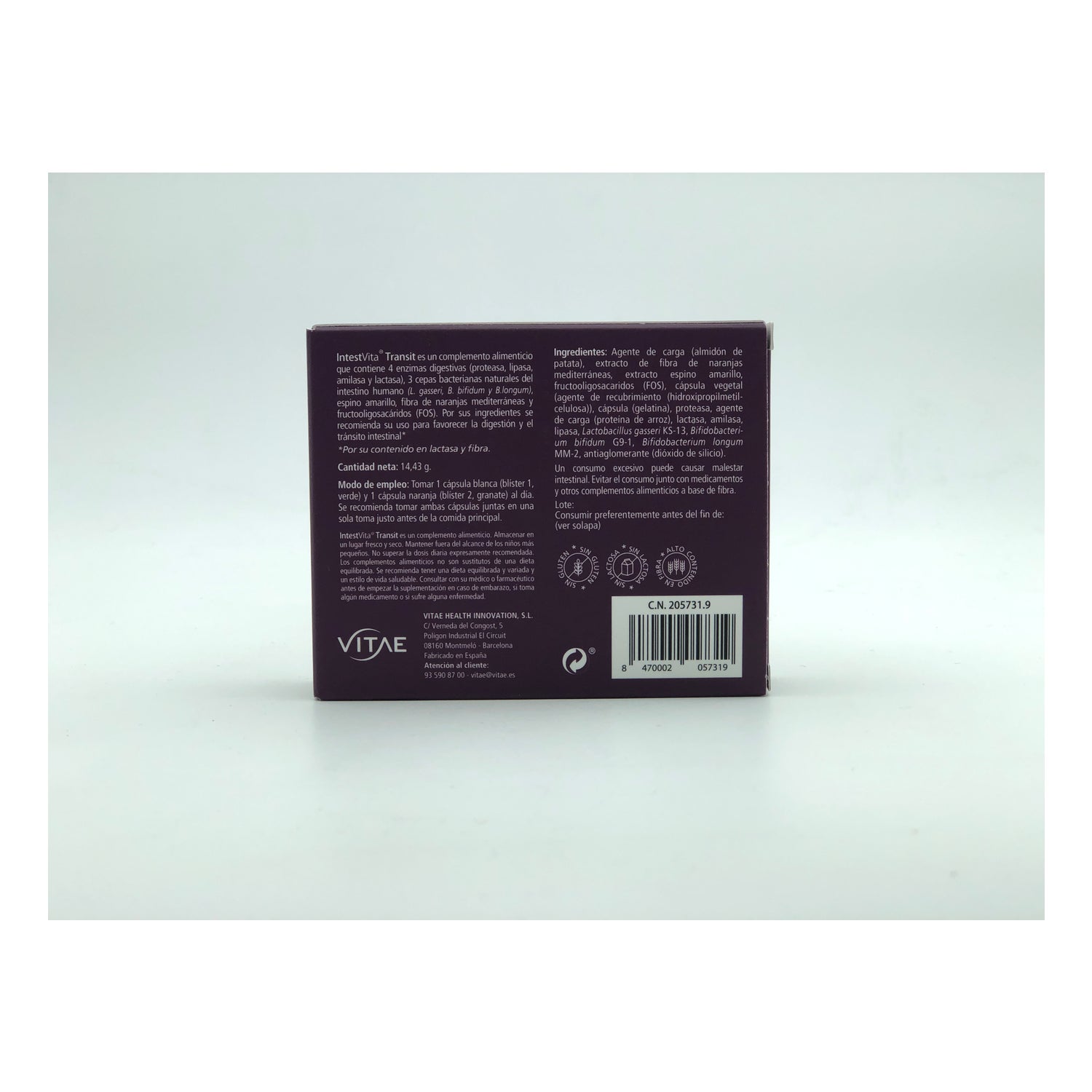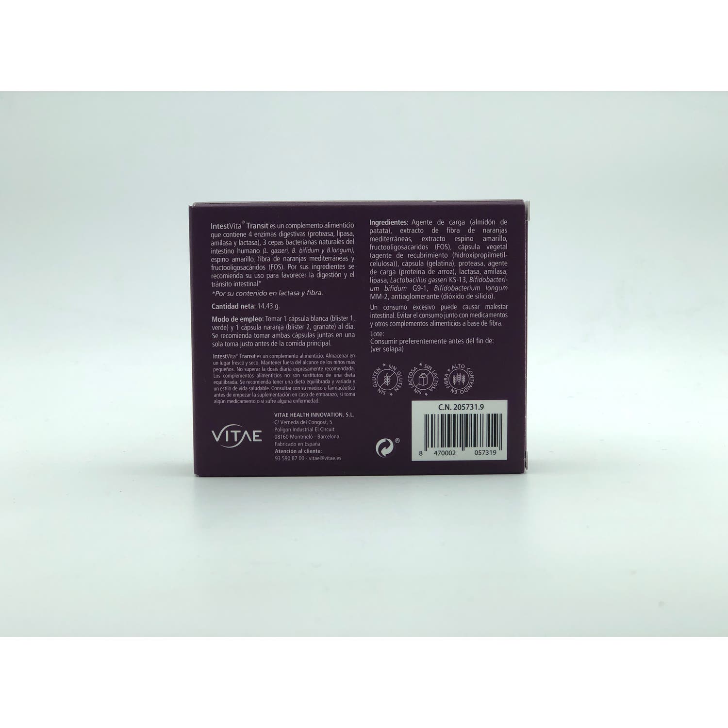Compuesto que está elaborado a base de enzimas digestivas, 3 cepas bacterianas naturales del intestino humano, espino amarillo, fibra de naranja y frutooligosacáridos (FOS).