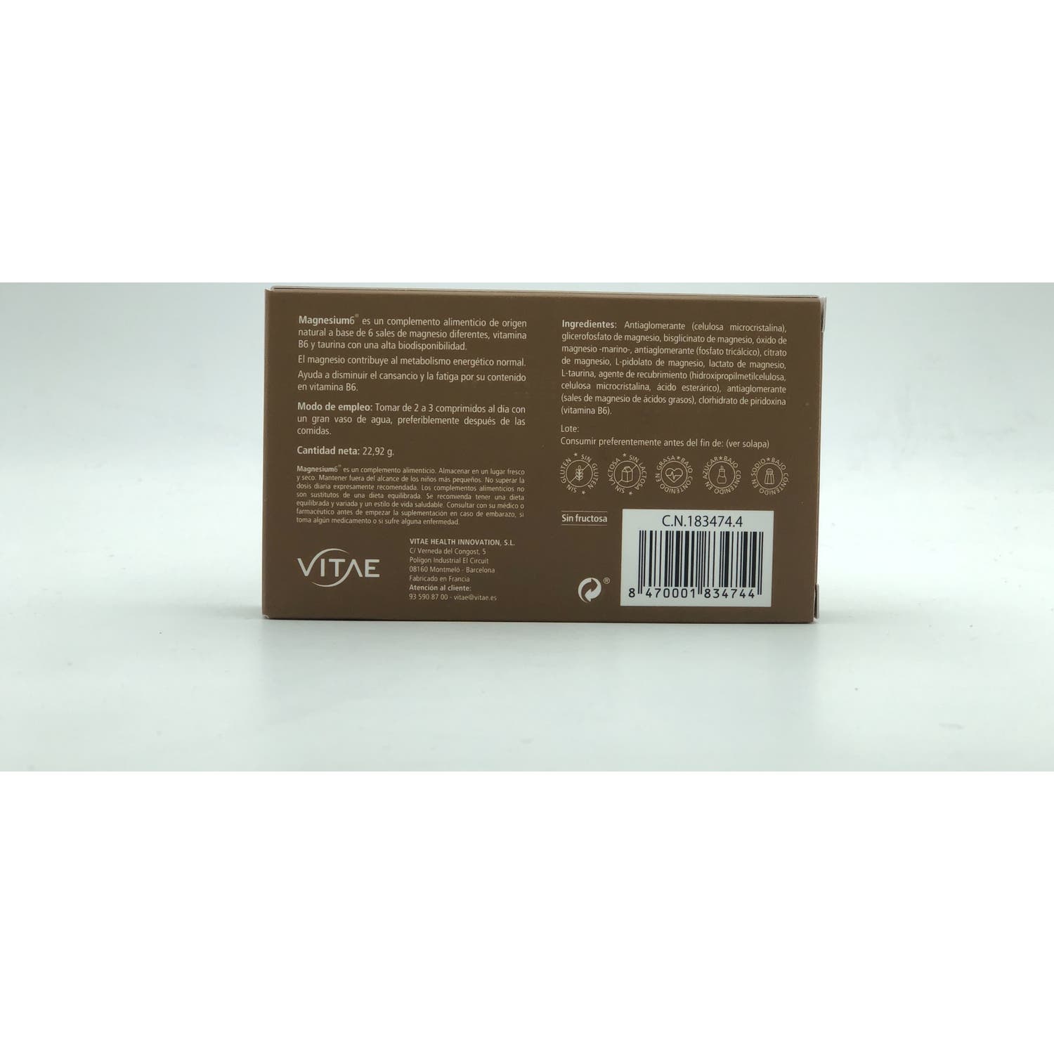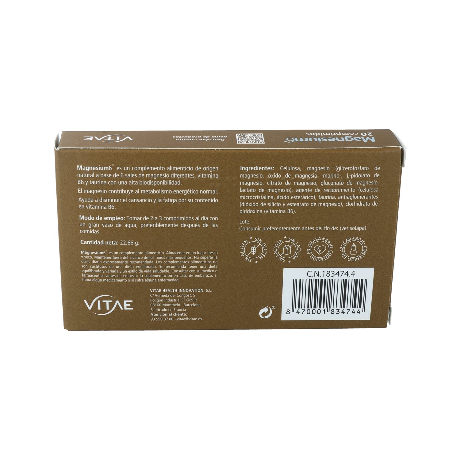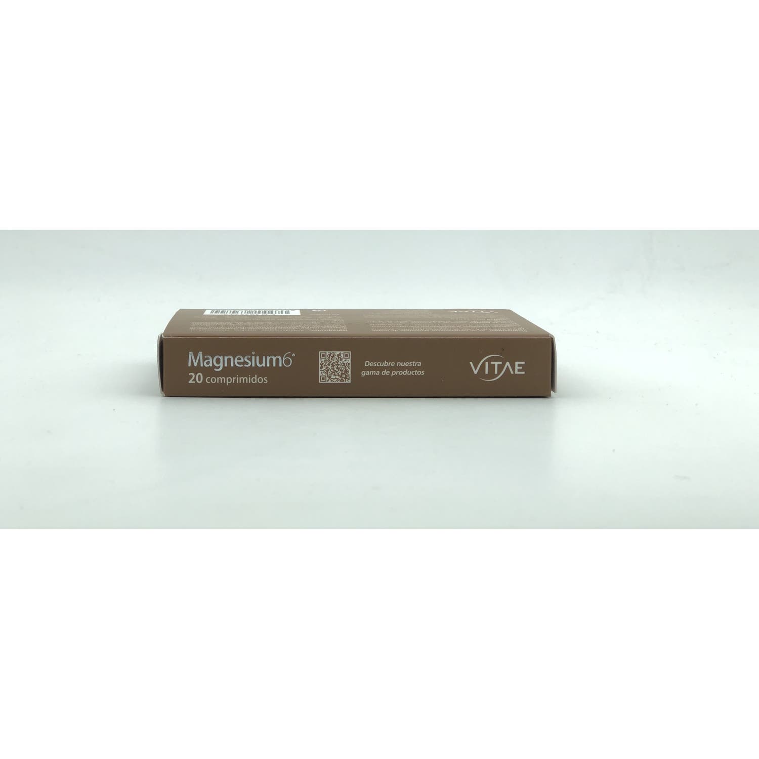 Vitae Magnesium6® 20comp es un complemento alimenticio a base de seis fuentes principales de magnesio, vitamina B6 y taurina con elevada biodisponibilidad. El magnesio es un mineral indispensable para un correcto funcionamiento del organismo, pues promueve y protege la transmisión nerviosa y contribuye a un correcto funcionamiento de los músculos.