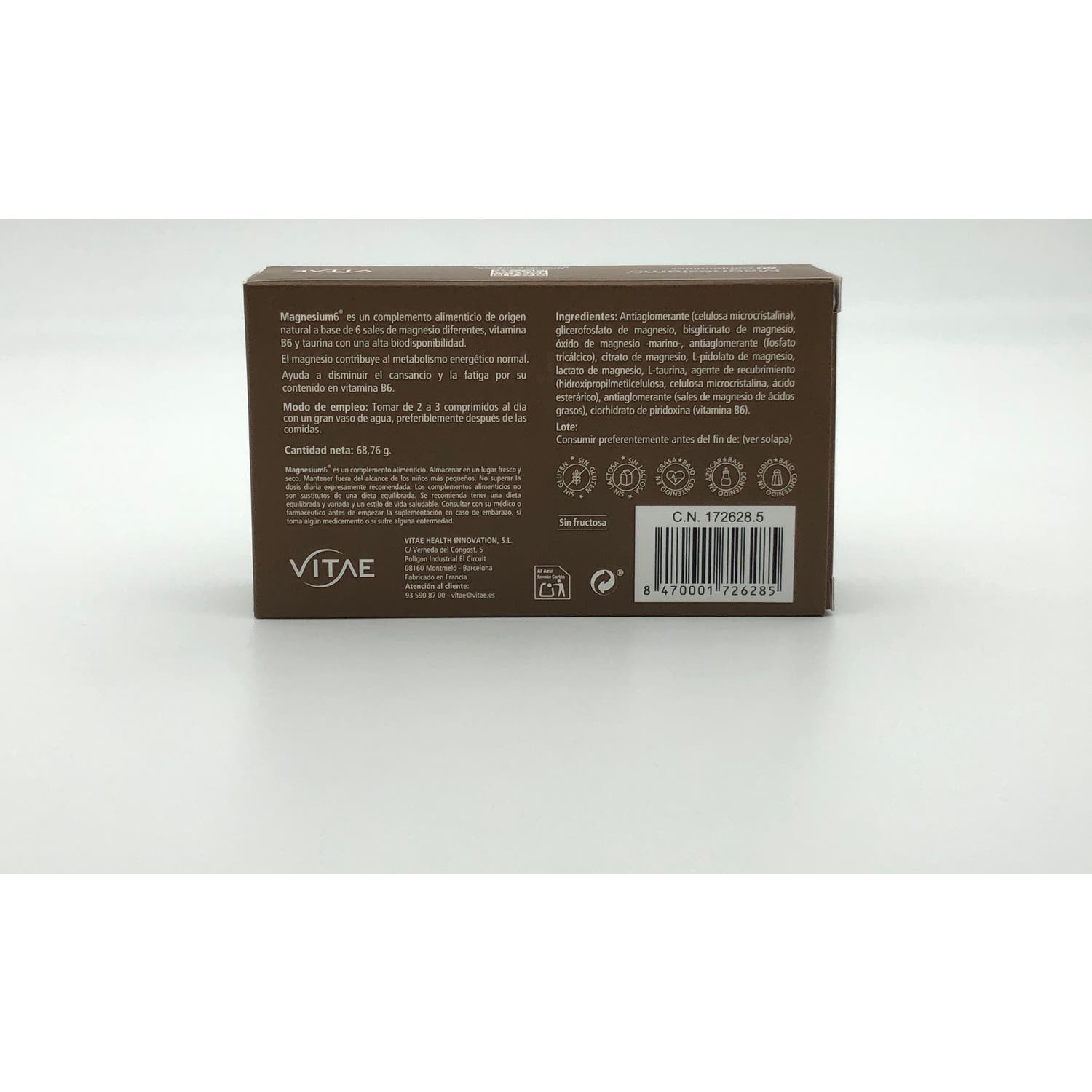 Vitae Magnesium6 60comp es un complemento alimenticio que contiene 6 sales de magnesio combinadas con vitamina B6 y taurina.